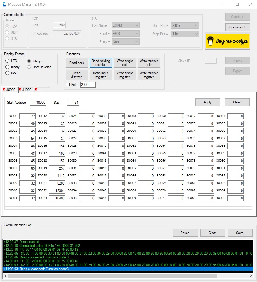 This capture is a few hours later and none of the values for registers 30000 - 30023 have changed, so I'm tending towards the conclusion this might be a red herring and we could be looking at static data of some sort?