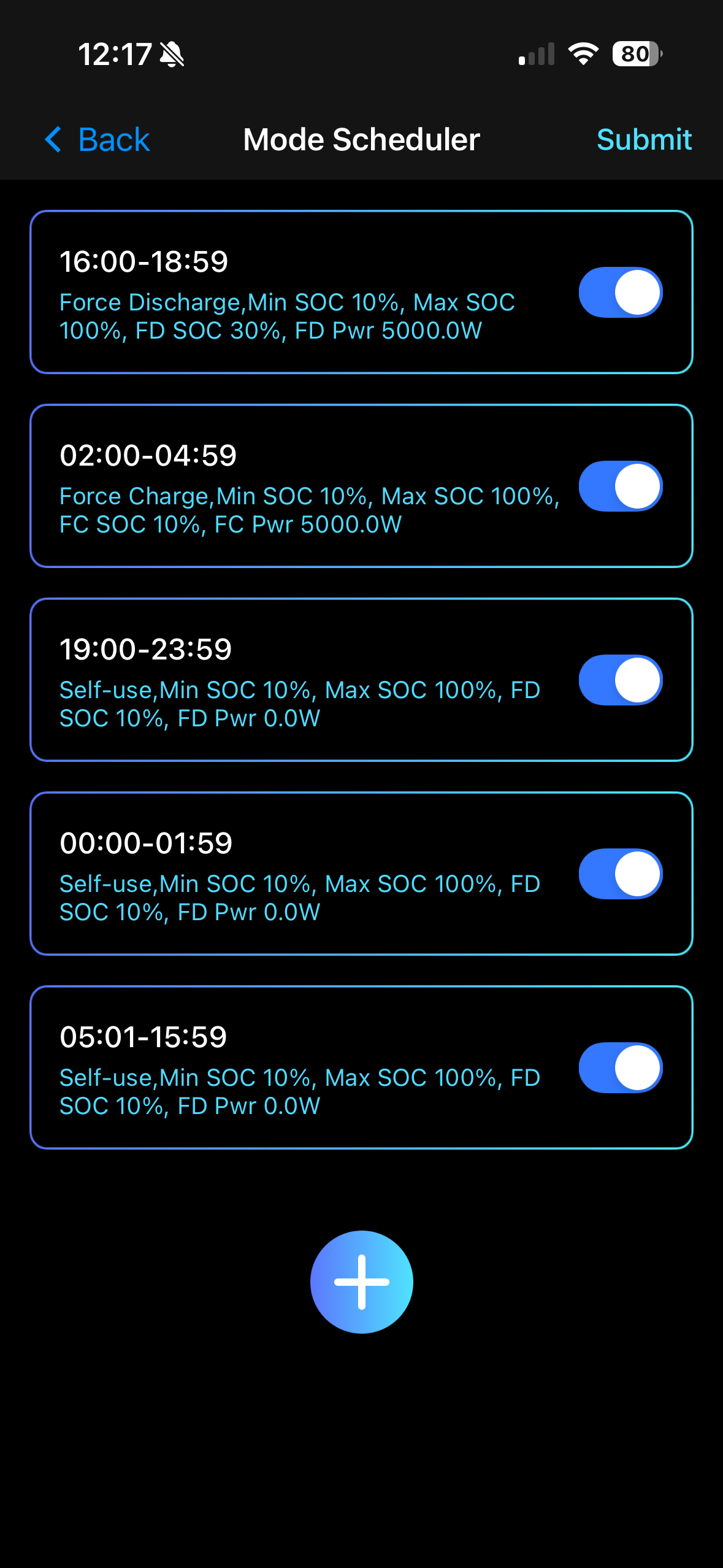 On your self use times, the inverter will always revert to Self Use when a schedule has ended, the only time you would need to set it is if you had changed minsoc as that is left as per the previous schedule when it ends.