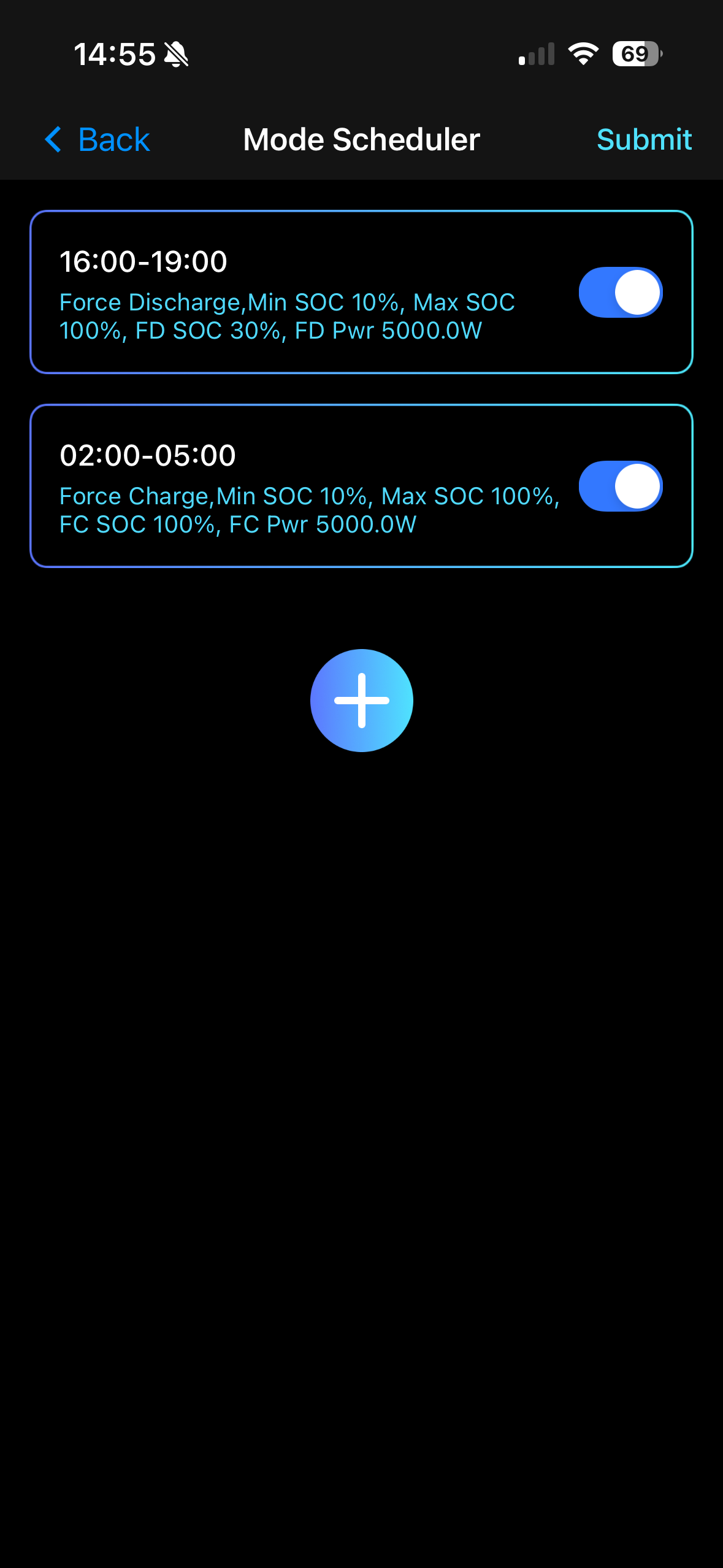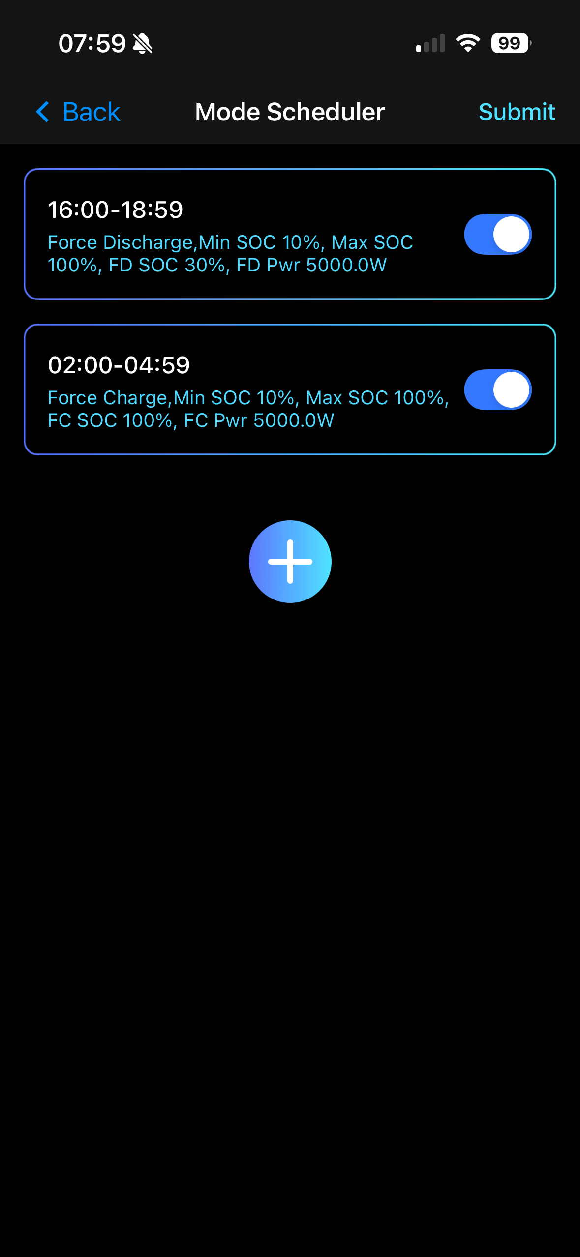 Hi, I am setting up a schedule so that I charge between 2-5am and discharge at 4-7pm, however discharging starts at 5am, see schedule below. We use Octopus Flux and we have a 5kw inverter.