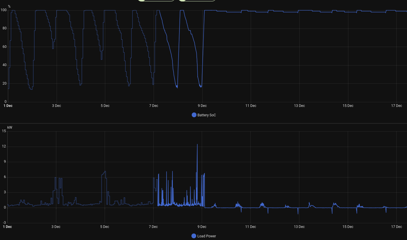 If anything the load seems somewhat linked to the solar, it is only ever a few units above it. At night this results in the load being shown as something like 7W, which is entirely implausible with lights, computers and even the oven on.