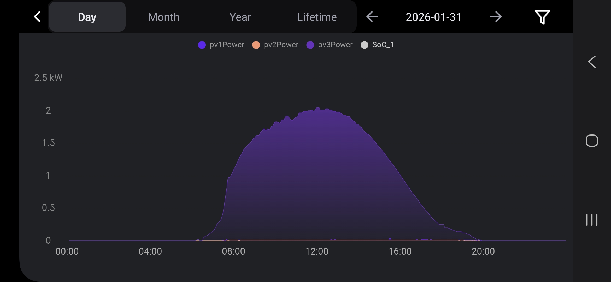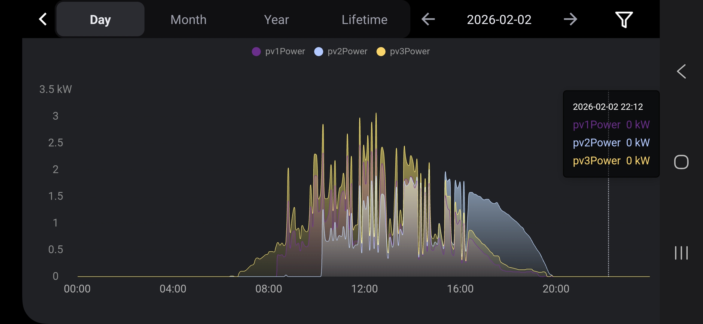 Here's an example where the 3 strings appear to be active most of the day. PV3 is always active, PV1 comes on around 8am, PV2 comes on around 10am. All 3 are generating through to dusk.