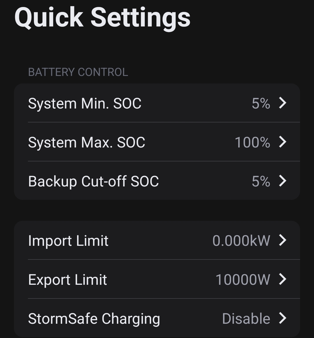 My settings (below) are pretty standard I think. Although potentially I read that the export limit can be overridden on the installer's end. Software I believe is up to date (screenshot below as well) System is only being run in self use mode, haven't played around with anyone else.