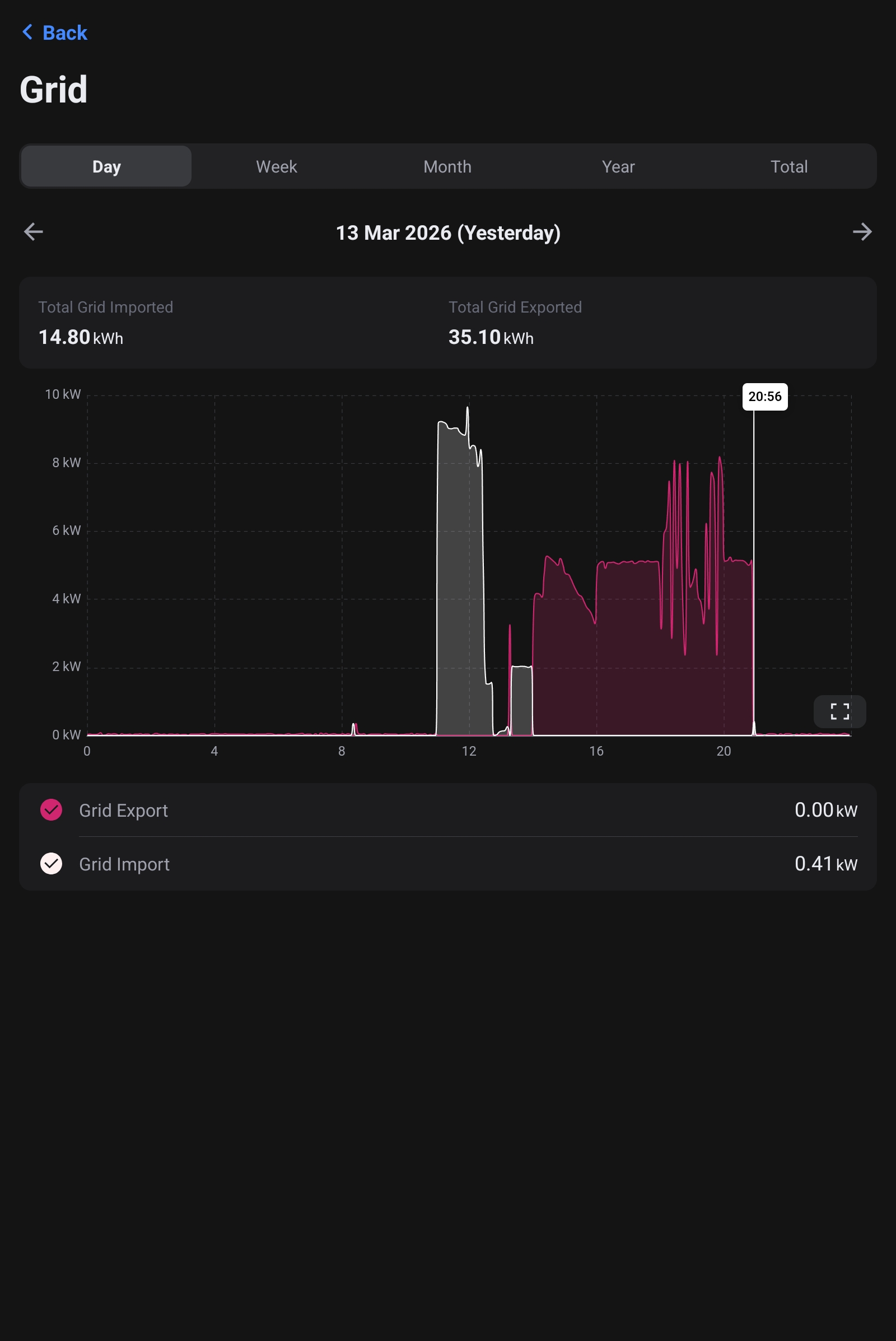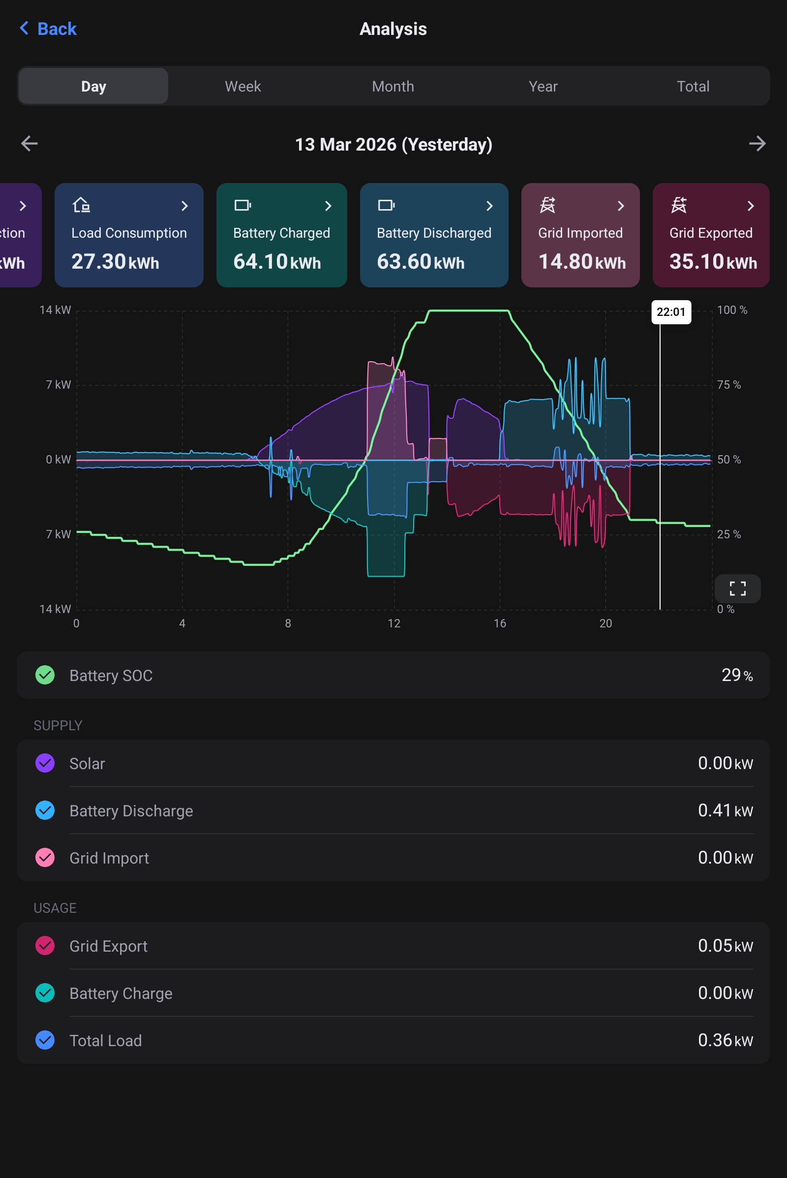 At the end of the FD cycle I generally end up with around 30% battery SOC which reduces to around 16% by the morning before the battery starts to charge again.