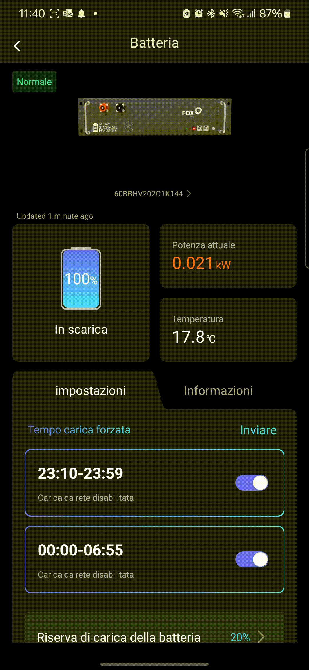 colui77 wrote: Sun Dec 15, 2024 10:00 pm Dears, while using foxcloud 2.0 I noticed that if I set the force charge from grid time without toggling it on, it is reset to 0:00 0:00. Did you also note it? Is this impacting the possibility to avoid the battery discharge in a certain time windows without forcing its charging from the grid?