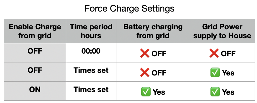 • Times set and "Enable charge from grid" enabled: battery will charge from grid. Same as checking both "Enable force charge" and "Enable charge from grid" preciously