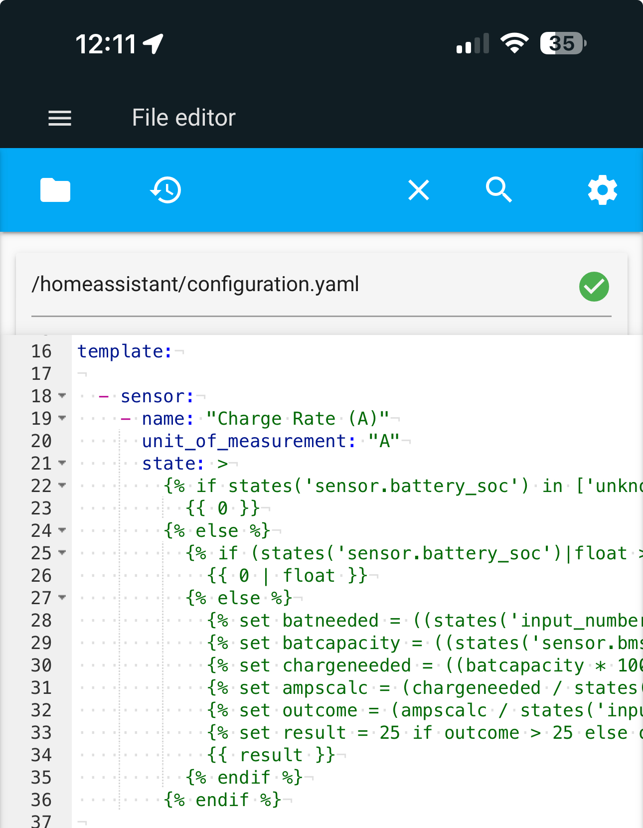 Cannot quick reload all YAML configurations because the configuration is not valid: Invalid config for [sensor.template]: expected dictionary for dictionary value @ data['sensors']['name']. Got 'Charge Rate (A)' expected dictionary for dictionary value @ data['sensors']['state']. Got "{% if states('sensor.fox_ess_h1_battery_soc') in ['unknown', 'unavailable'] %}\n {{ 0 }}\n{% else %}\n {% if (states('sensor.fox_ess_h1_battery_soc')|float > (states('input_number.fox_battery_overnight_setting')|float * 100)) %}\n {{ 0 | float }}\n {% else %}\n {% set batneeded = ((states('input_number.fox_battery_overnight_setting') | float - states('sensor.fox_ess_h1_battery_soc') | float) / 100) %}\n {% set batcapacity = ((states('sensor.fox_ess_h1_bms_kwh_remaining')|float / ... expected dictionary for dictionary value @ data['sensors']['unit_of_measurement']. Got 'A'. (See ?, line ?).