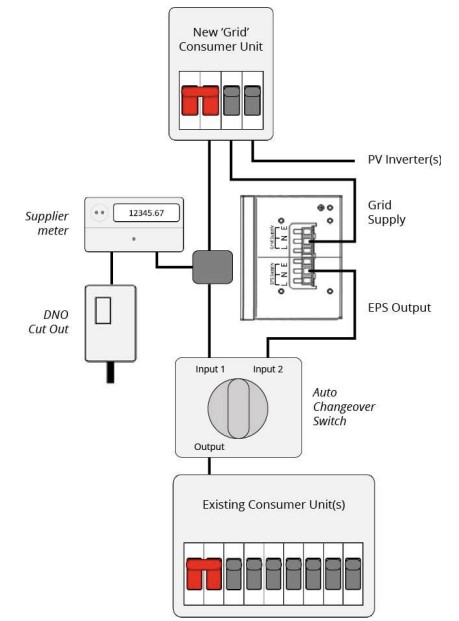 The main difference is that the “changeover switch” is an automatic one which senses the voltage on the grid/EPS and switches automatically.