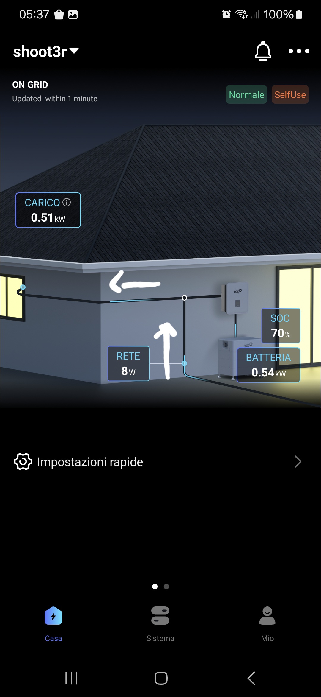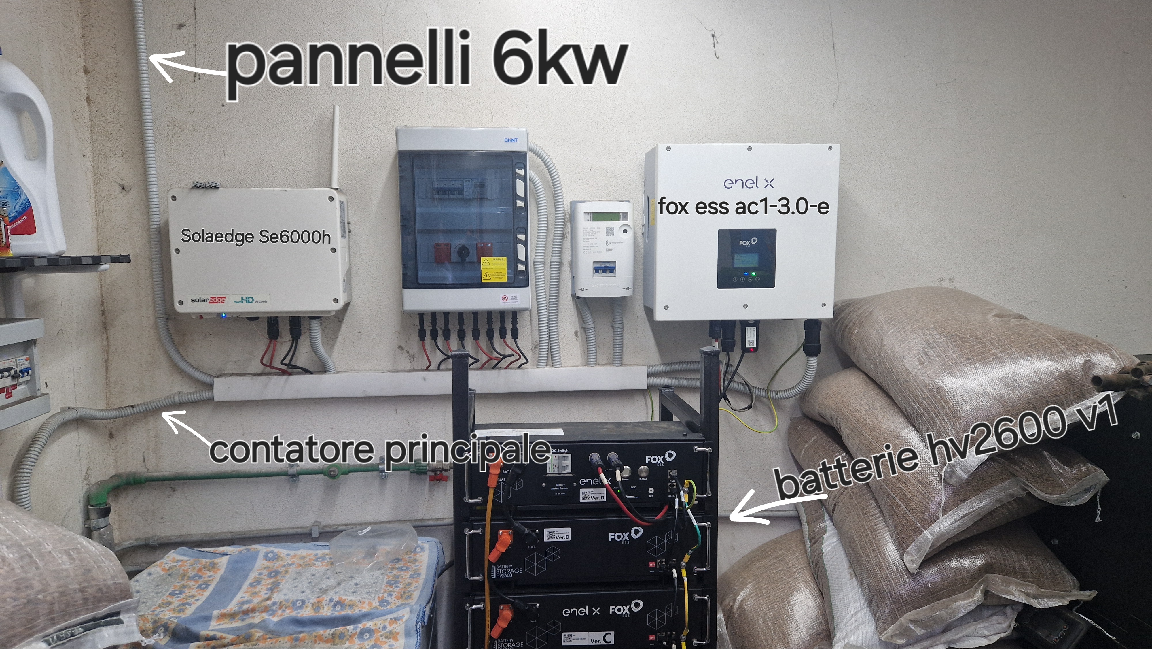 Salve a tutti sono nuovo su questo forum.avrei delle domande.in allegato c'è la foto del mio impianto con 16 pannelli+solaedge collegati all'inverter tutto da 6kw della solaredge collegato a sua volta all'invertert della fox ess ac1-3.0-e. Volevo sapere tale inverter fox ess ac1-3.0-e ha una presa di back-up li posso collegarci direttamente le luci di casa con le prese?in modo che se manca corrente plsso utilizzare quella?dovrei solo collegarci l'impianto e senza immettere nella rete come?c'è uno schema da seguire perchè non riesco a trovarlo.ho chiesto all'installatore e sinceramente penso che mi stia truffando in quanto mi ha chiesto 600€ per montare il funzionamento di backup(scusatemi non sono un super esperto)mi fermo al livello base di elettricista.altra domanda,mi è stato montato tra contatore principale e l'impianto un ct meter ma non era meglio metterne anche un secondo tra i 2 inverter?se si è possibile chiedere lo schema di montaggio?grazie a tutti e scusate