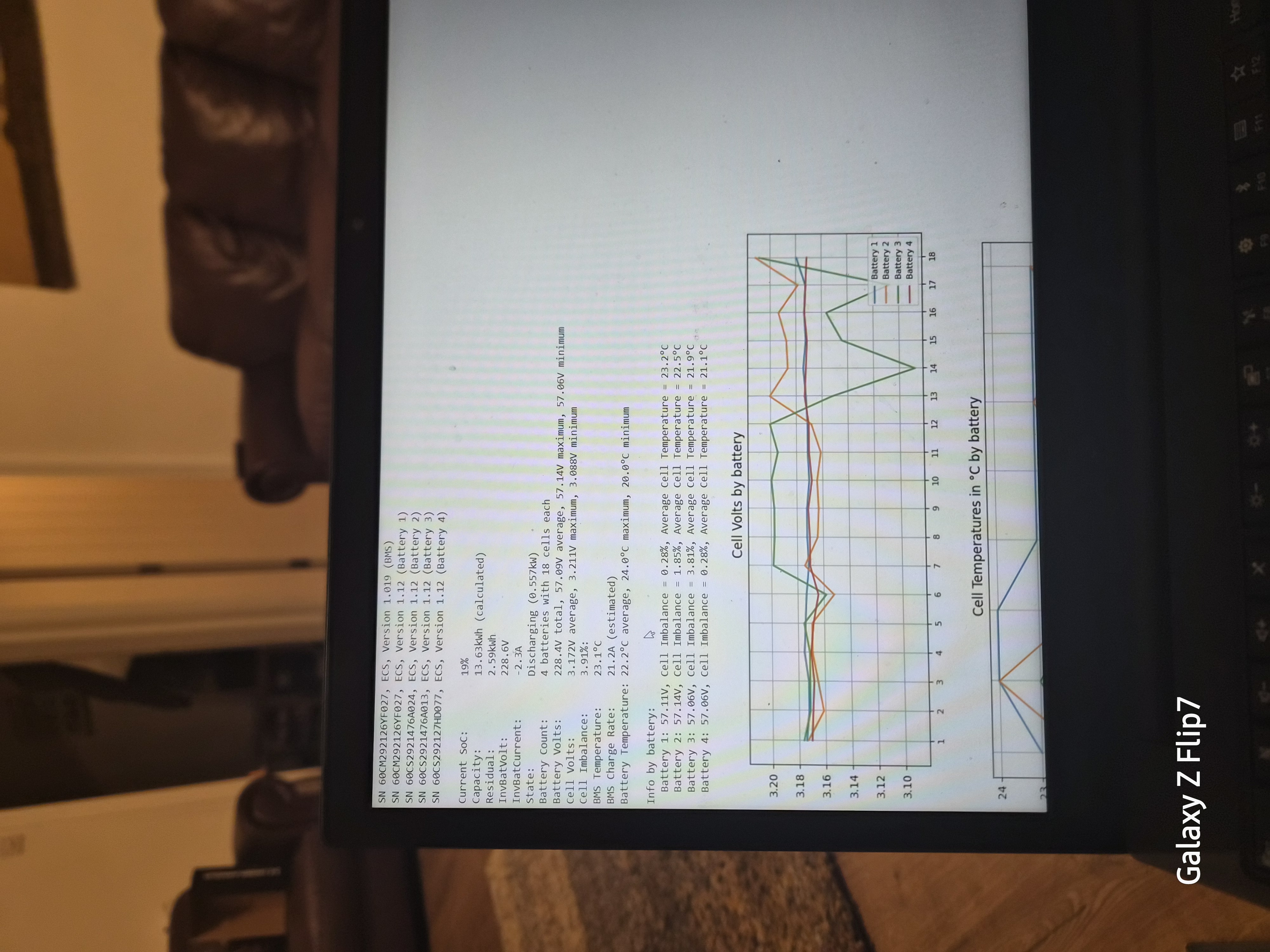 The attached shows the cell voltages just as the Soc is experiencing a sudden drop, on this occasion it dropped from 24% to 10% SoC in about 2 minutes when the load/ discharge was only around 500w.