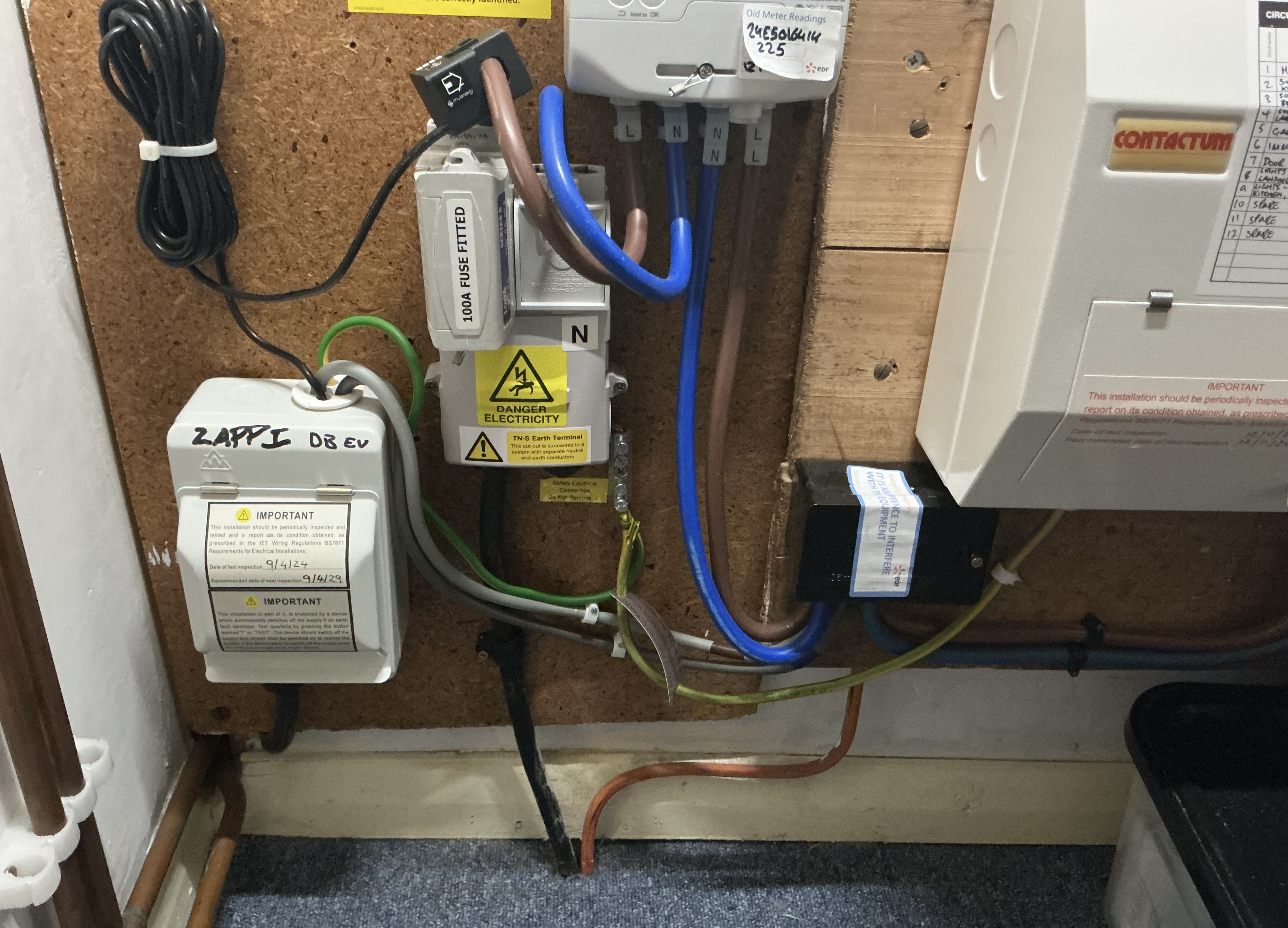 Currently the Zappi CT clamp is across the whole house load on the i/c live tail from the DNO fuse.
