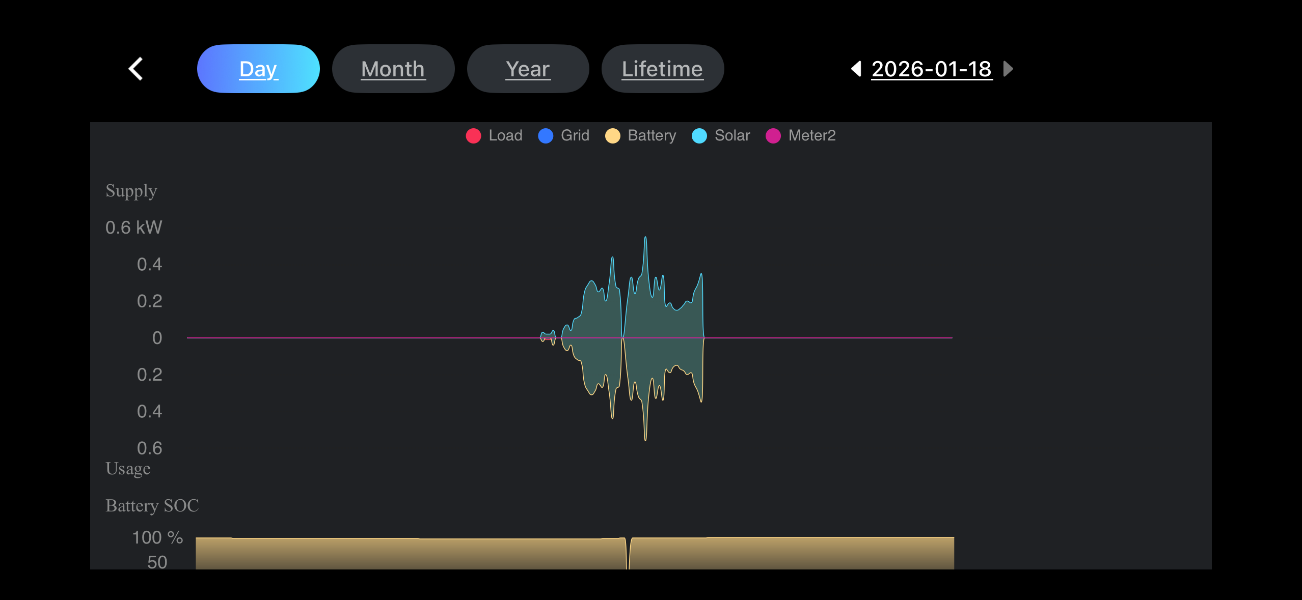 2. It is showing that I am gathering no energy at the moment, despite it being quite bright. The 0.7kWh yield it mentions for today is the energy it harvested to recharge the battery to full and then stopped.