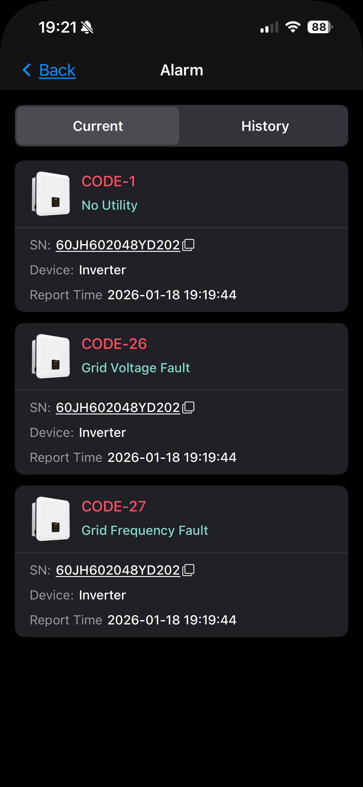 The graph shows that it isn’t attempting to balance the load which is what you see if there is a CT problem, but according to the alarms there is no grid connection to the inverter which will be the actual reason.