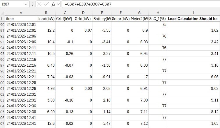 Since Grid_Pos is always positive, and Grid_Neg is always negative, and Battery(KW) can contain negative and positive values, I think the (Load KW) calculation should always add rather than subtract..IE the formula should be