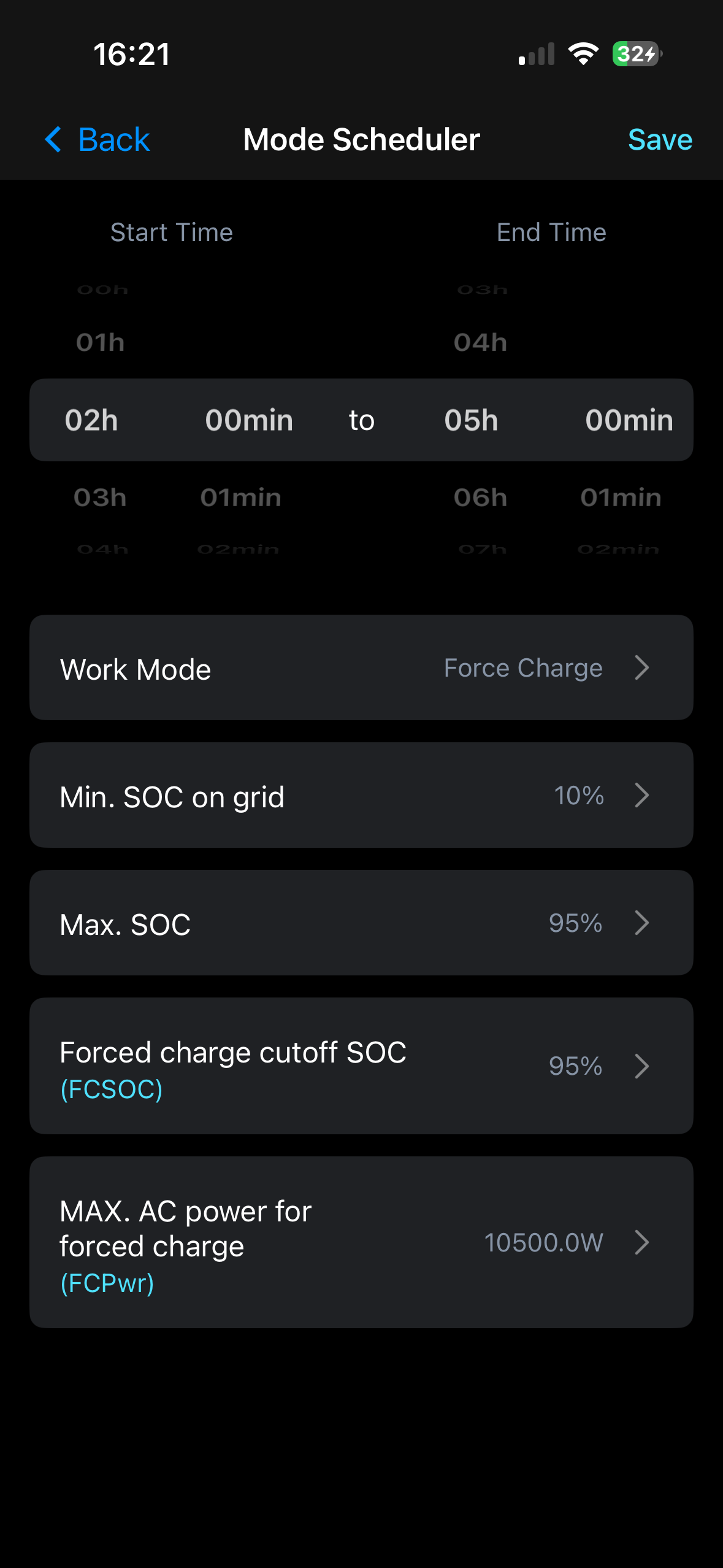 I watched a good video yesterday on how to set schedule to charge 2-5am and discharge 4-7pm. All times input, pressed submit and got success notification. Cleared the existing charge times on previous screen in app and pressed enable against schedule.