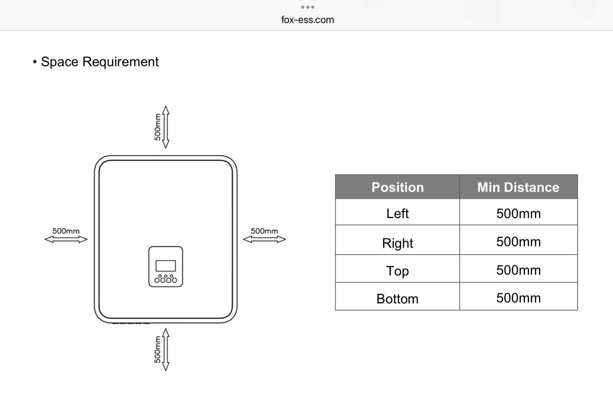 Fox specify 500mm around each ‘side’ of the inverter and the batteries are close on the left hand edge, however the cooling fins run vertically at the back of the inverter and you have good clearance to allow air-flow.