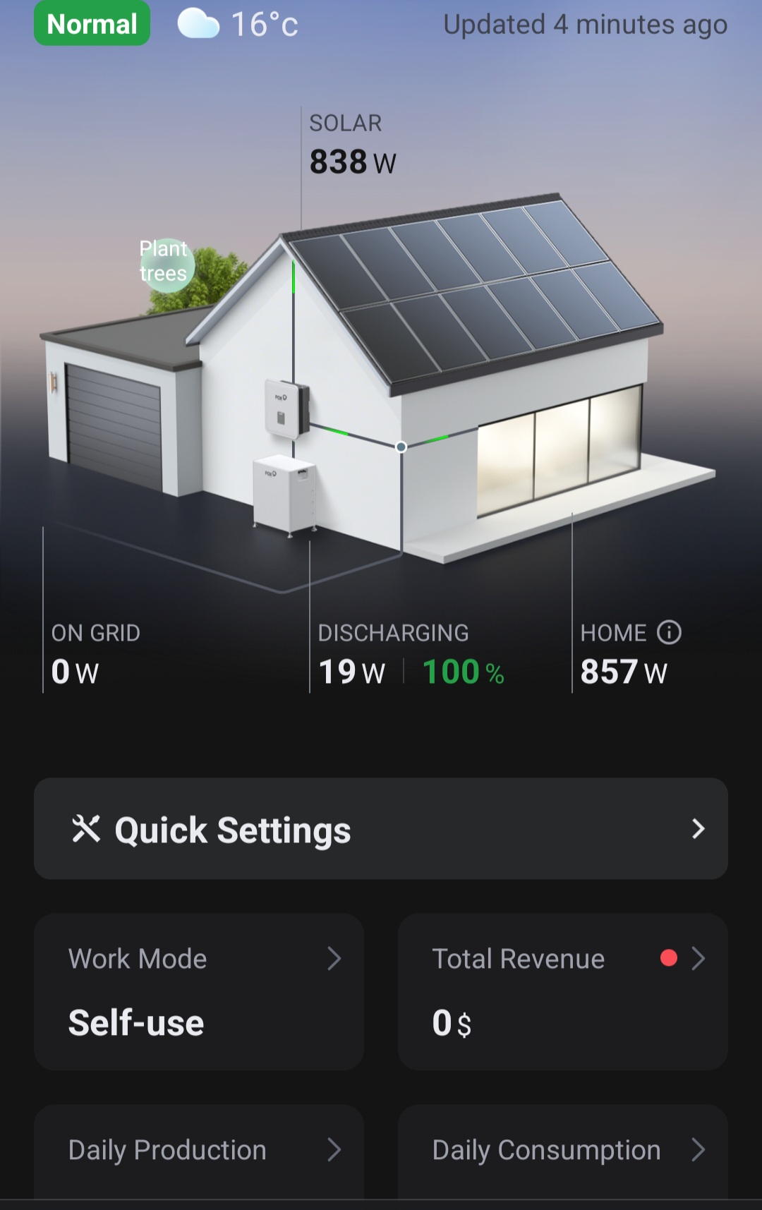 - through out the day my solar seems to be generating to charge battery and home usage (approx 5kw, again nothing on in house) 0 on grid.