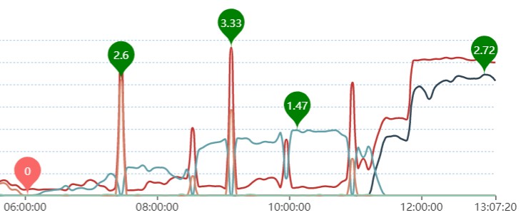 But since 26-May I have had a strange "stepped" output trace and much reduced power generation. On a perfect sunny day, output gets to 1.7/1.8KW by 0930ish and stays flat for a couple of hours, then shortly before midday it suddenly shoots up to 3.2KW where it again stay flat until it starts decreasing as the sun goes down. Please see attached screenshot of yesterday's trace. And as I type this, exactly the same thing has just happened at 11:40 - one minute we were generating 1.8KW, the next 3.2KW with no change in conditions. But it'll stay here now an hour or two before starting to decrease, it definitely won't hit the 4.8KW high at 1230ish we were enjoying a month ago.