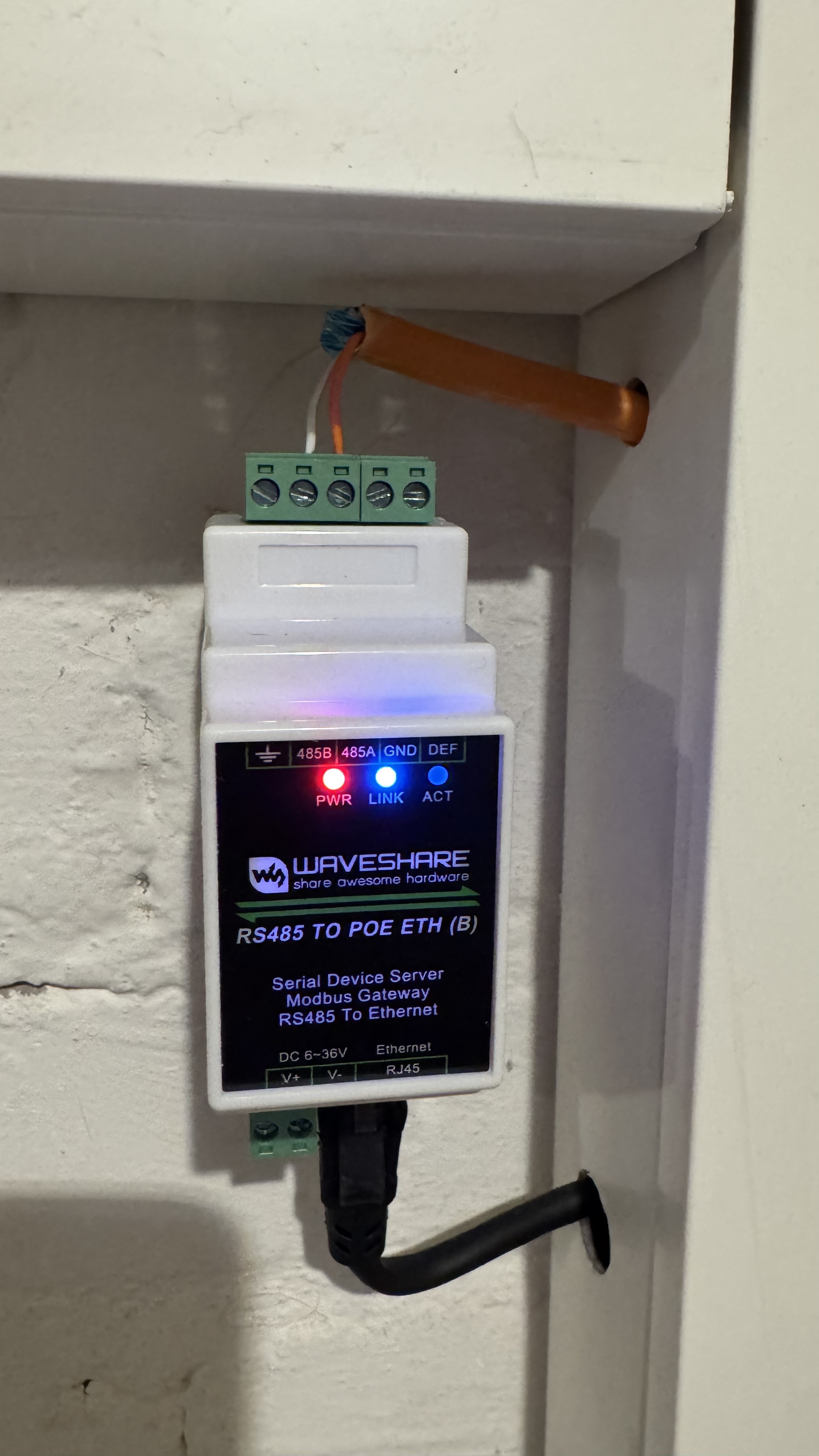 I've got a Waveshare RS485 TO ETH B unit, which is wired up to the comms port and is on my LAN. I've also got v1.14.0b3 of the foxes_modbus component.