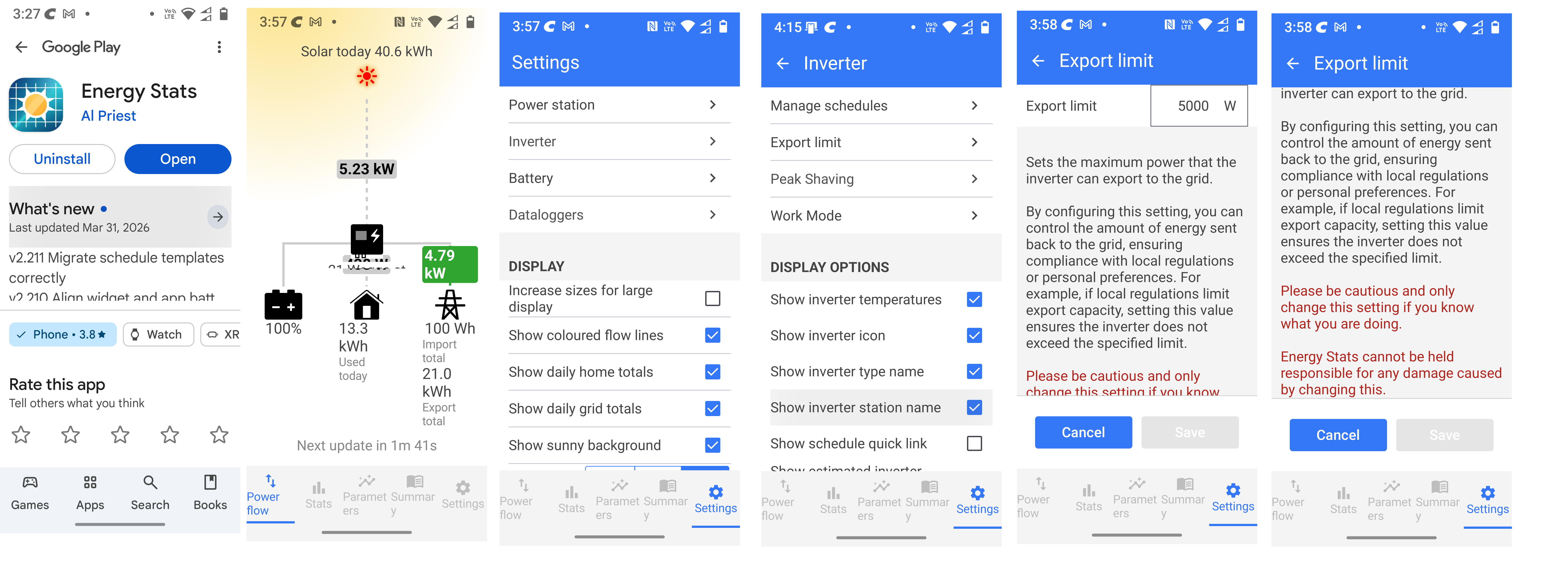 For those interested the “Export Limit” value can be changed thru the “Energy Stats” app as follows: