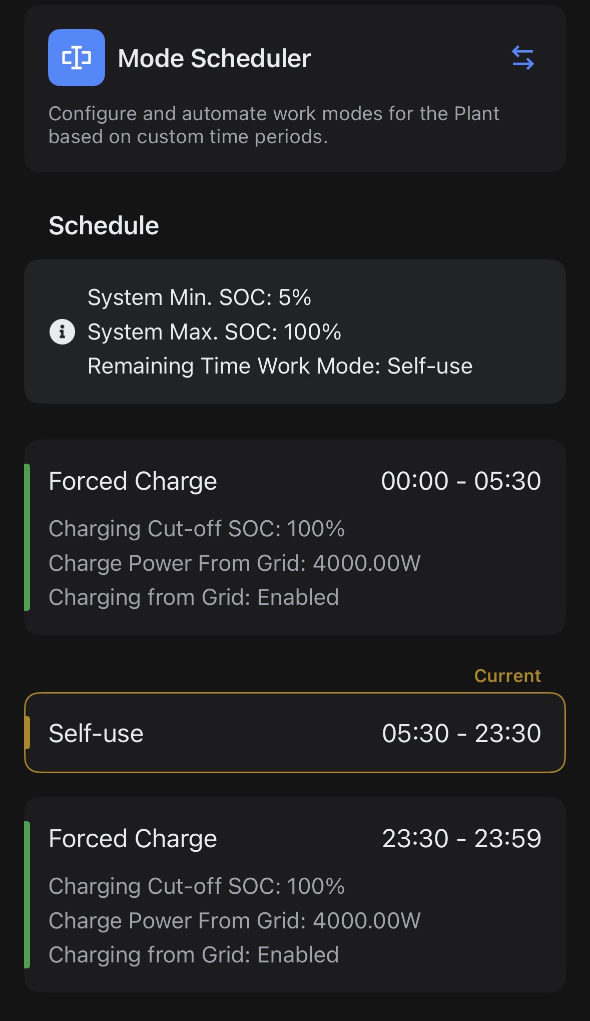 If I change the remaining time work mode to forced charge it starts right away, so it’s just ignoring my schedule. Brilliant.