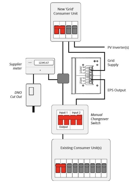The main difference is that the “changeover switch” is an automatic one which senses the voltage on the grid/EPS and switches automatically.