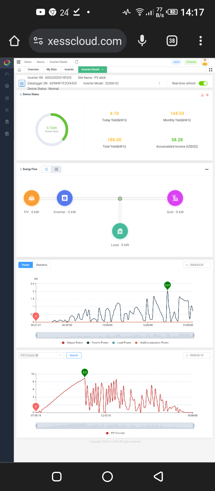 Can you log into the Foxesscloud website, on there on the device page, in the graph at the bottom you can select variables to look at - can please select pv1current and pv2current and post the screenshot.