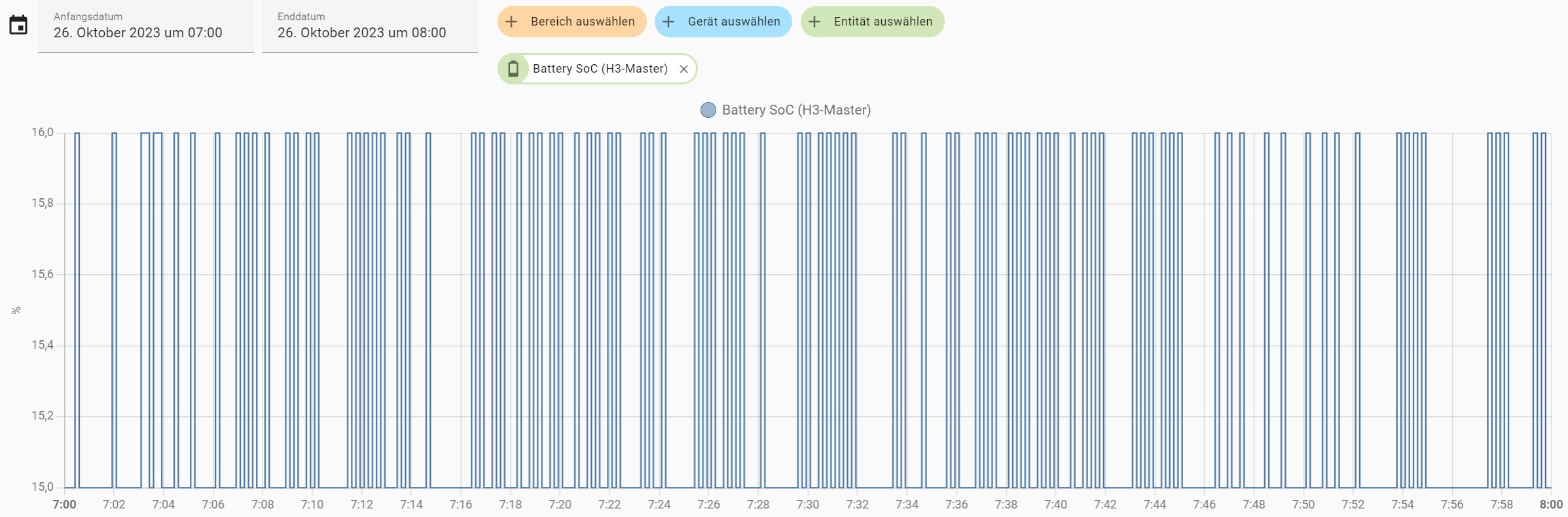 During the day, when there is not enough solar power from the roof to charge the battery higher than the minimum SoC, the H3 inverter switches the battery on and off every minute - all day long. This can't be good for durability in the long run and uses up energy unnecessarily. FoxESS is aware of this problem and has been working on a solution for weeks...