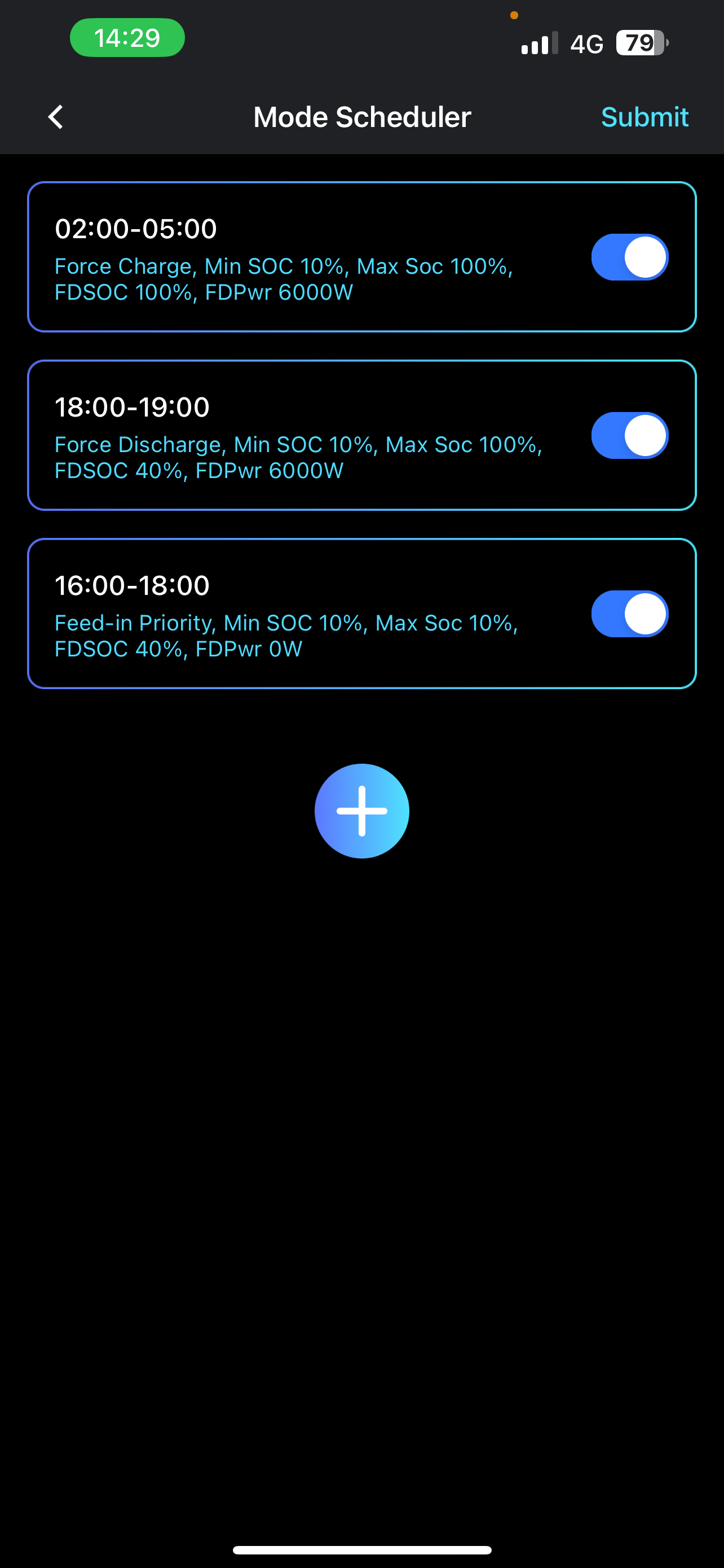 If your battery discharges quickly, you might be better from 4pm to 5:59pm setting 2 items in your schedule, the first one would be to set the inverters work mode to 'Feedin First' - that will export everything you are generating (after the house load is covered) and will only charge the battery if you generate more solar than your agreed export limit (G98) which is unlikely.