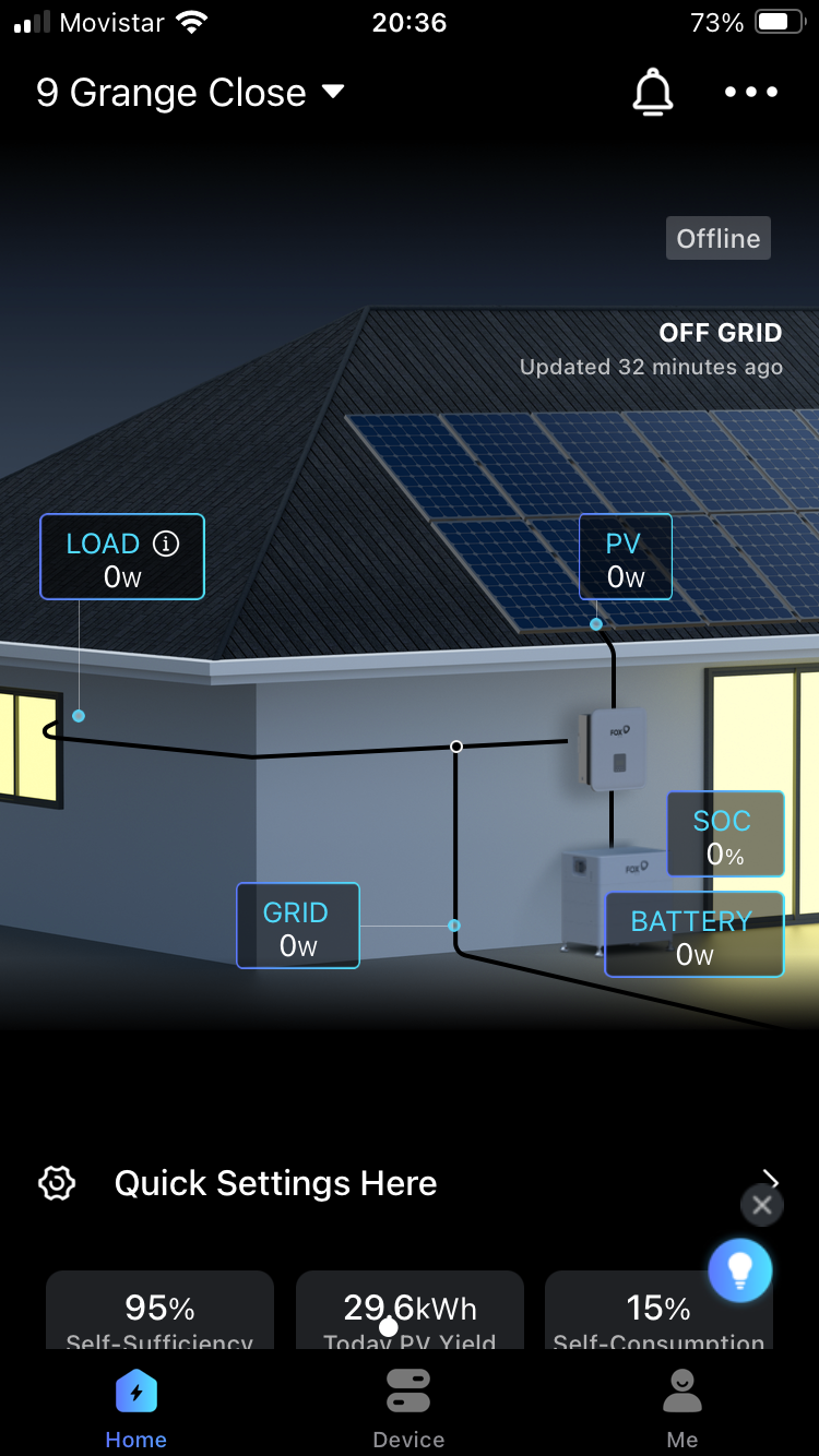 The app should then show your load as a positive figure (probably not much as you’re away) if there is no PV and there is charge in the battery it will be used to power the house, if there is PV generation you should see the battery charging.