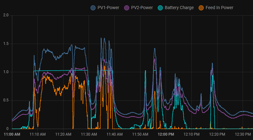 We had a sunny day with no clouds, and I was producing approx 2.2KW !!!!! when looking at the graphs it showed my batteries charge maxing out at 1KW, then the rest going to the grid/house load