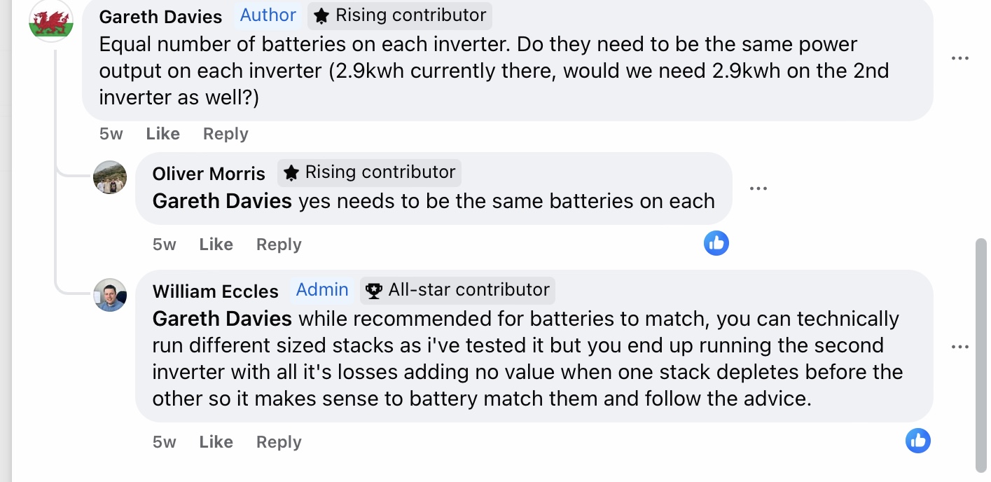 On running in parallel that sounds like a lazy answer - if both inverters have similarly spec’d battery stacks it will work, it will work even if they are slightly different i’ve seen that working on a system in South Africa (also see attached from Will) - It’s possible Fox have changed guidance because of issues in the field - obviously you don’t want to breach warranty but I would definitely get that confirmed in writing.