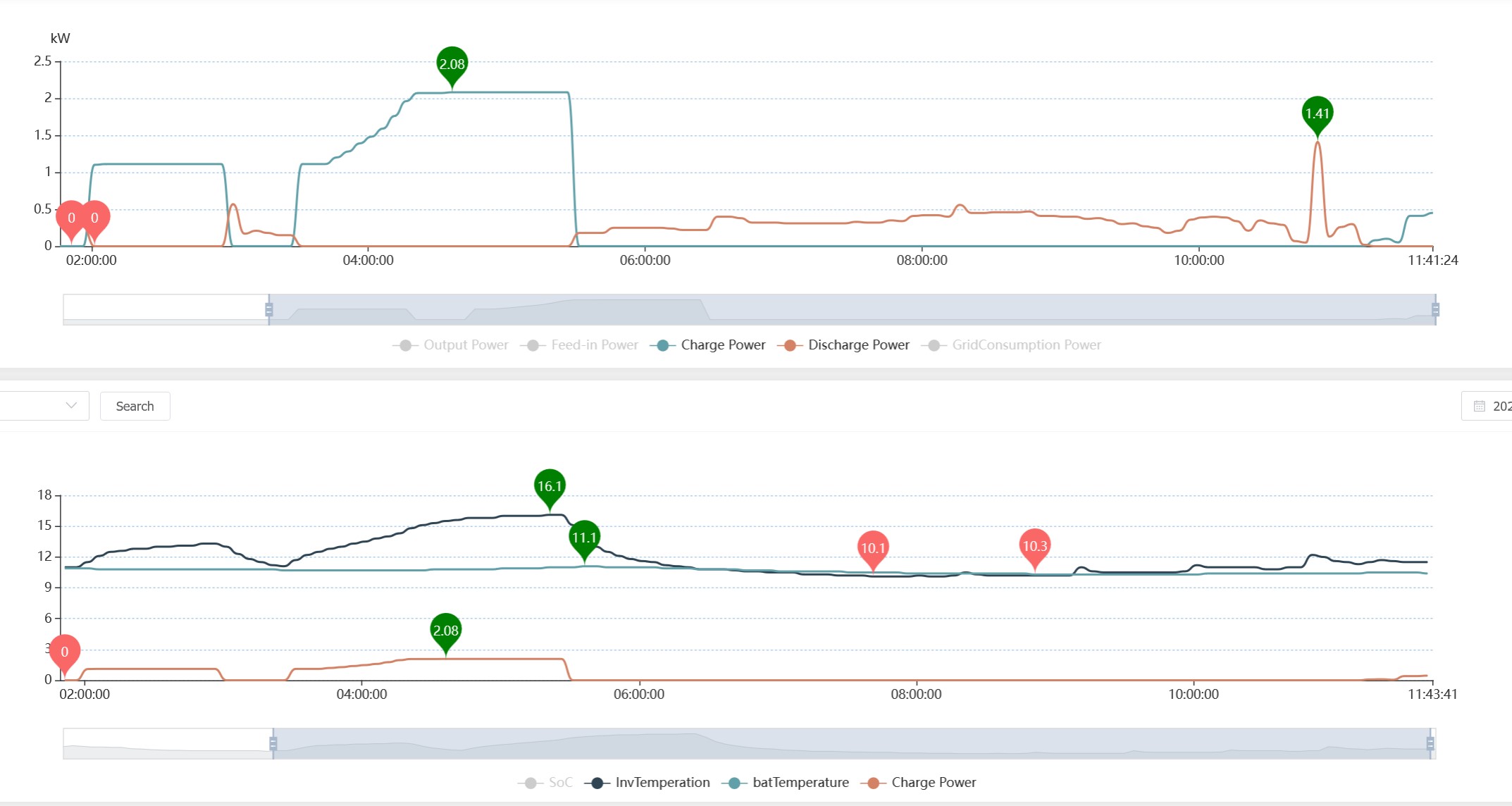 However in my system it seems more related to inverter temperature. I attach screen shot from the web page and the battery temperature is fairly constant (15 to16) (except today when 10 ish) whereas inverter temperature increases markedly and so does charging.