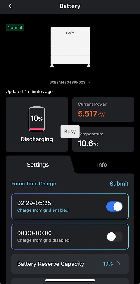 As well as seeing the wrong data, I am also unable to set my battery to its usual overnight charging slot - I get the ‘busy’ message on the attached screen shots. I think the problem could be with the inverter rather than the app, and that I might need to do something with DC and AC switches.