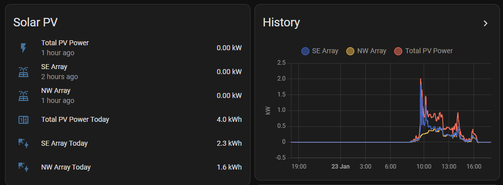 Honestly though, the modbus route with home assistant is the best way for this. You can also correct the load figures which will be wrong with two inverters (a bug, see my thread "Load Power". Here is how I have it setup for the PV generation (SE array is the H1, NW array the F3600):