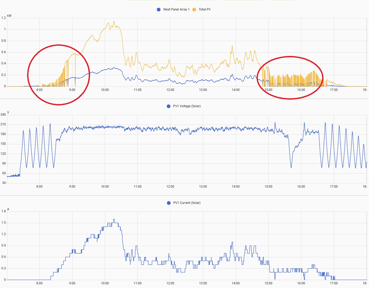 The other day I had my firmware updated on my KH7 inverter, to take advantage of the additional data made available to home assistant in that version. All seemed well, and I can now get battery cell temps but I've noticed a strange behaviour in the PV load and individual string outputs. Rather than the normal graph I used to get, where the output varied with the sun, but always had at least a small output in daytime, I am seeing the output total and all string outputs drop to zero for a few seconds to a few mins, then pop back up again to where I'd expect. It seems to only happen at lower outputs, up to about 0.6kW total but it didn't do it before the update. I've attached screenshots for the total PV power and PV string 1 (West Panel Array 1) with current and voltage also for PV1 for before and after the issue showed up.