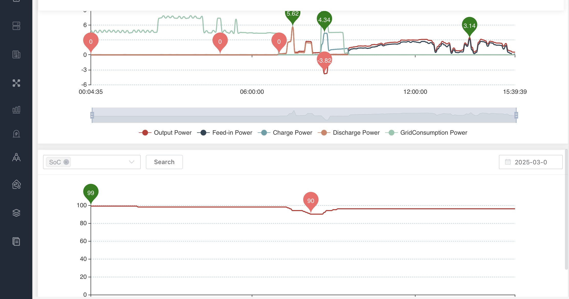 At the bottom of the page I have graphs of the the usual lines of Output Power, feed In Power, Load Power, Grid/Consumption Power, Charge Power and Discharge Power.