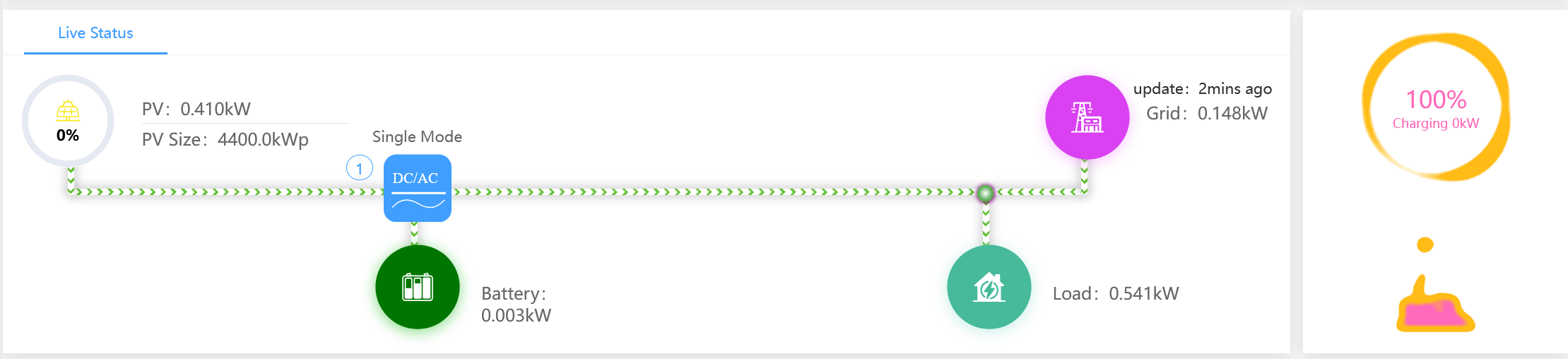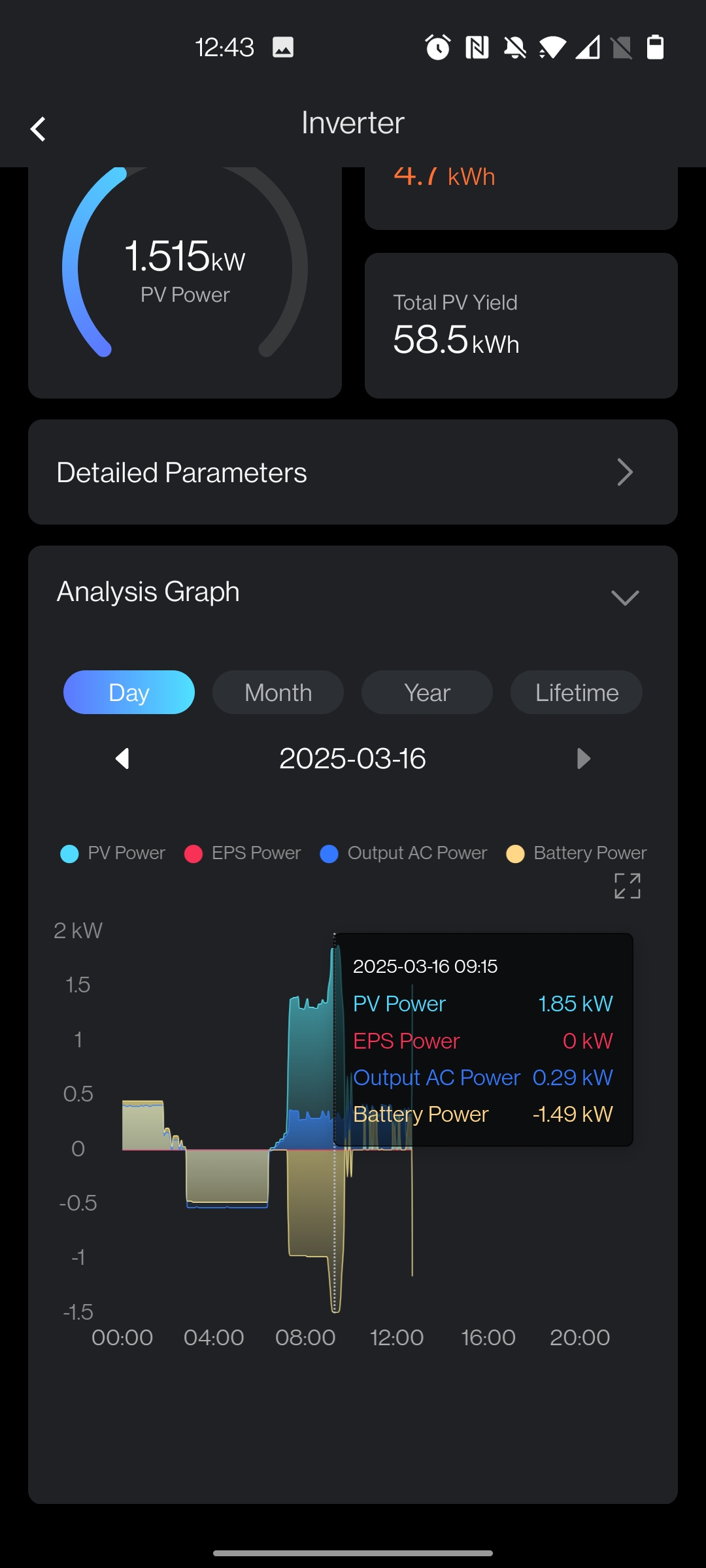 The issue I'm having now is that to my mind, the export numbers look extremely low and generation to match. It was beautifully sunny this morning, and the graph initially shows PV generation of 1.85kwh, most of which was going to charge the battery, the leftover dealing with the house load and a small amount of export (~0.2kwh). The issue appears to be that once the battery reaches 100% SOC, the PV generation plummets, back to a value (~0.4kwh) that's suspiciously close to just the sum of the load + minuscule amount of exporting. It was still extremely sunny out and even with it being UK winter/spring with a nice south facing roof I would expect to see more PV generation than that. Occasionally the PV generation would drop to 0 and it would start using the battery, then PV kicks in again, charges up the battery once more, then goes off again in a strange cycle.