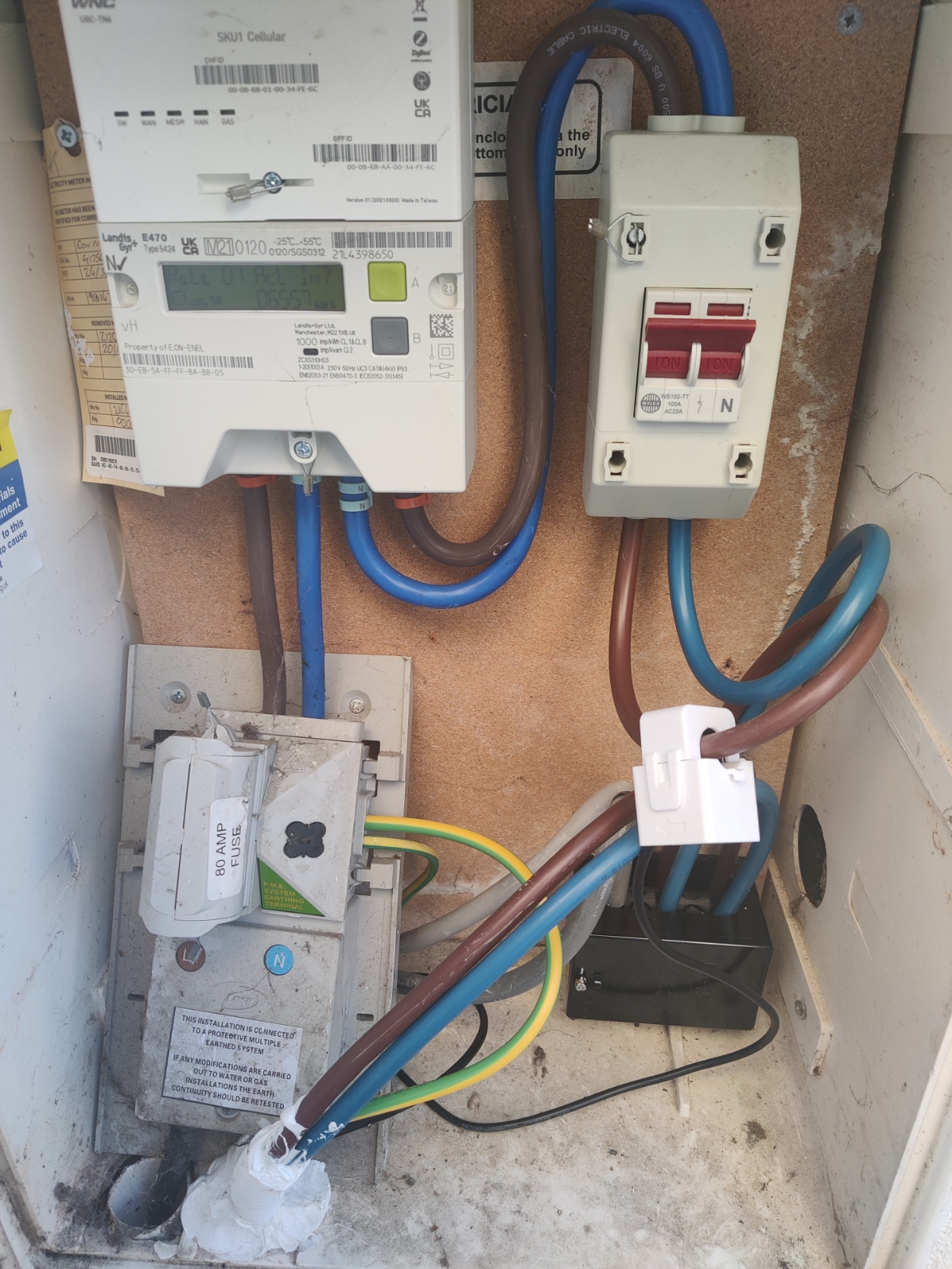 I've attached an image of the meter cabinet- I don't know the first thing about what I'm looking at but the clamp (white box?) looks to be clipped onto the live wire... there's just an isolator between it and the suppliers meter- could that be an issue?