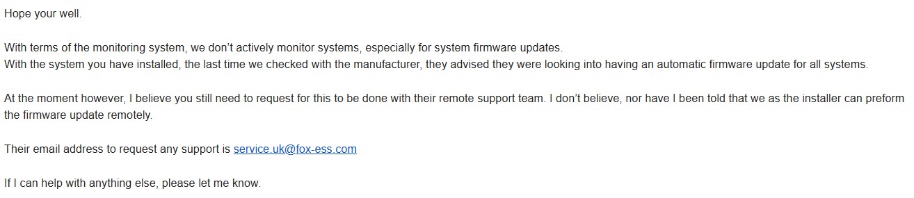 So, got my Fox Solar and Battery (EP11 and H1-Gen2) installed just over a month ago ... and loving the generation .. however, after reading some of the posts on the forum around firmware updates etc ... messaged the company to ask what they support ... the response are below. Just kinda wondering what my options might be ... is it a case of going to Fox each time for any firmware updates / installer only inverter changes (such as meter compensation)