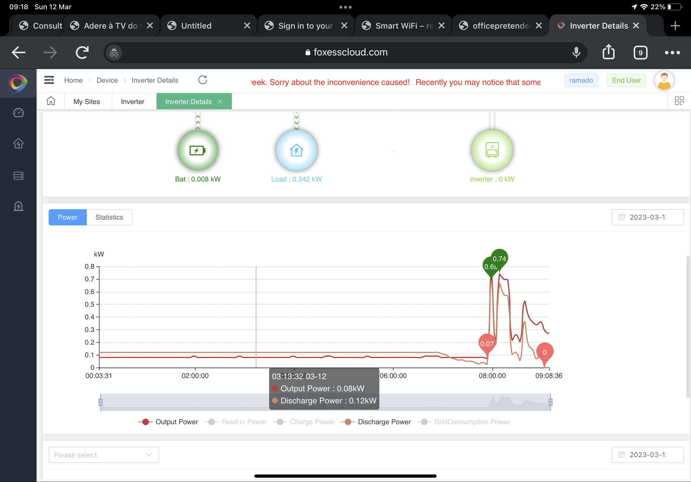That said 122w seems high, but it's difficult to tell because the app only updates every 5 minutes - I would normally expect to see around 70-100Wh for a 5kw H1 inverter.