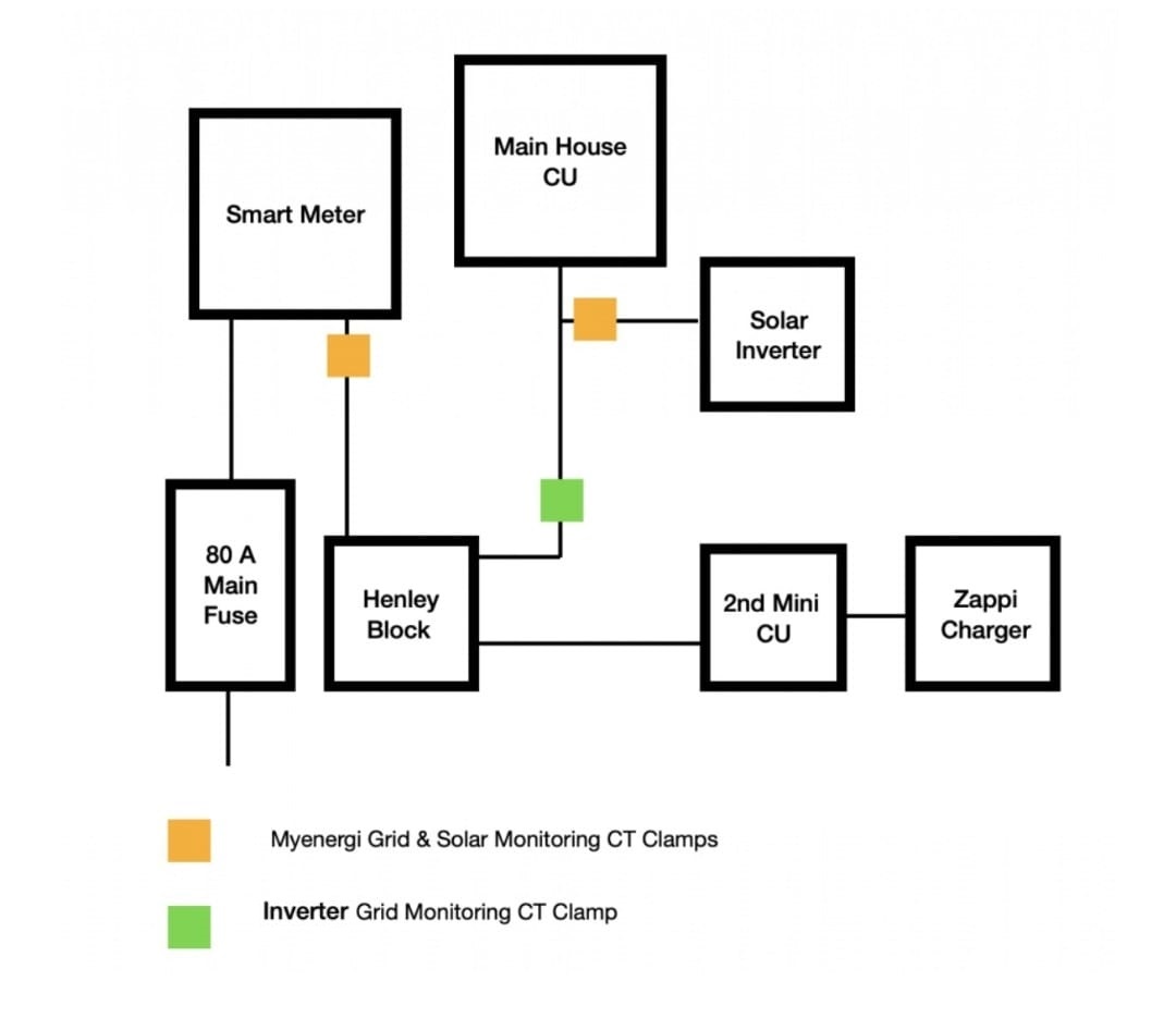 If you look at this diagram and imagine this is just one of your phases coming into the house from your meter, the live feed will be split using a Henley block (a very large terminal connector), one side of the feed goes to the house load and the inverter and the inverters meter (or CT in this diagram i.e. the green blob) is placed so that it can see everything that happens after it.