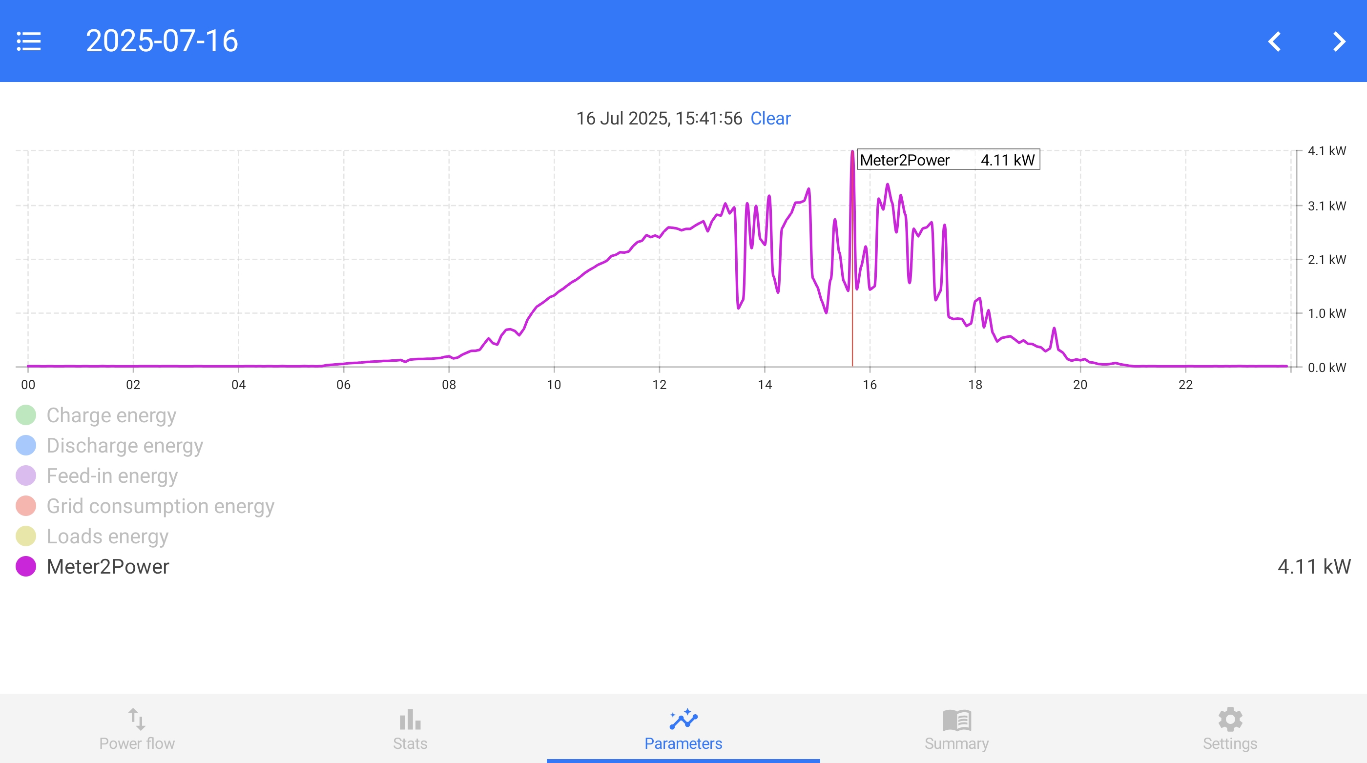 To remedy that, I've done a couple of screenshots for each of two days which I selected because (a) 11 April was a clear day and the curve for PV generation (it's listed as "Meter2Power", don't ask...) is about as pretty as it gets and (b) 16 July was a day which started out clear and got cloudy in the afternoon. It was also the day when the maximum output I have recorded to date took place, 4.11kW at 15:41:56.