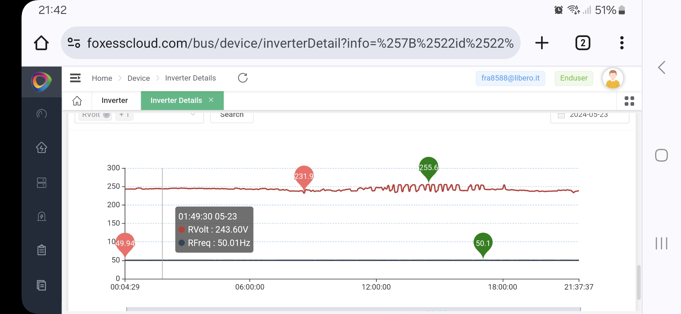 sorry for the many posts here I put the rfreq and rvolt graph and calculate that from around 12:00 I had 6 errors avg set to 253 (done yesterday because otherwise it would give me frequency error while I was using the batteries and I know it's not related but by setting it to 253 it doesn't give me a frequency error) now I put it back to 257 as you told me yesterday and set the DAC lower than 47.50hz