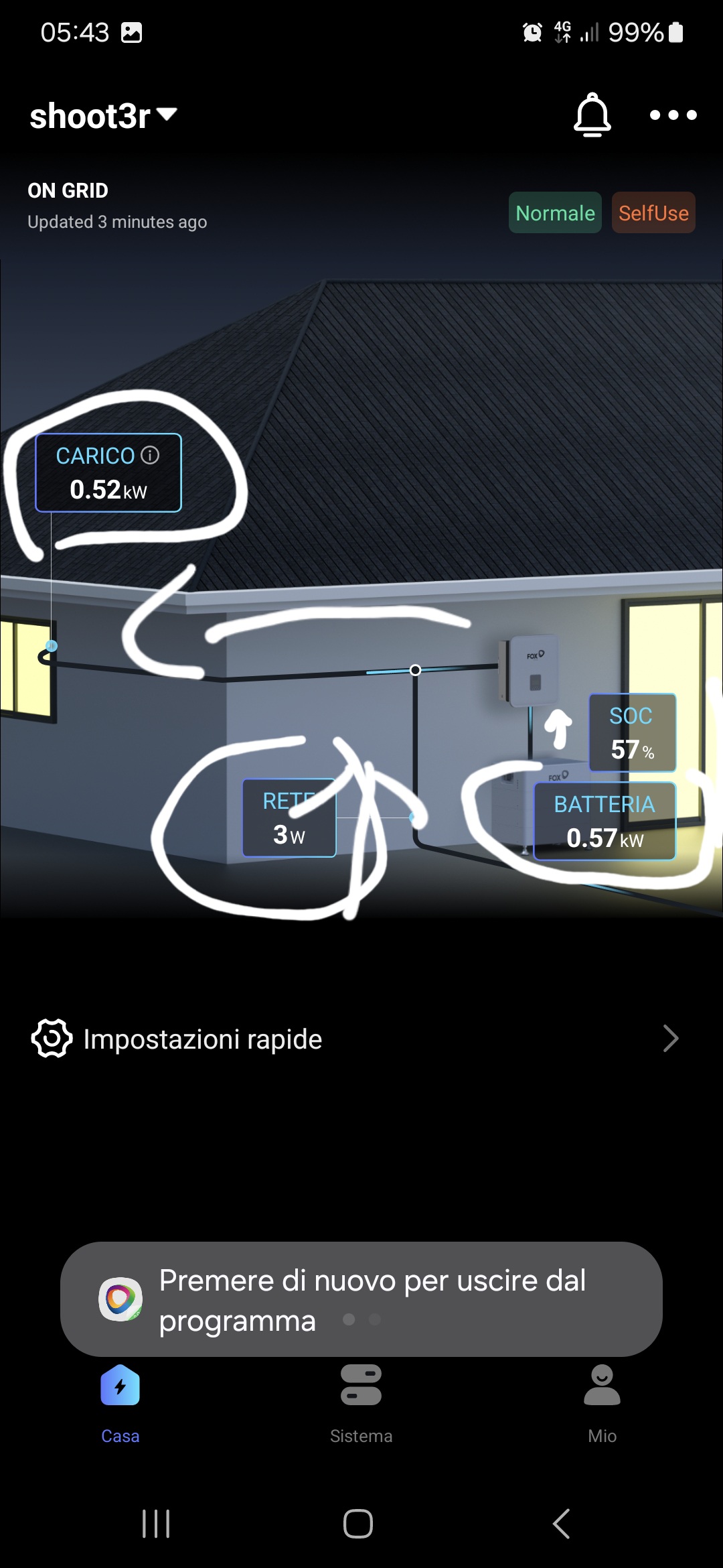 if only my fox ess ac1-3.0-e inverter was compatible with the Solaredge optimizers I would avoid the Solaredge inverter itself (because this inverter also goes into overvoltage and disconnects) by connecting the panels and optimizers only to the Fox Ess inverter. Then I increase the vac to 263.2 and I'll see how it goes. Can I ask you another question? It's normal that during the night, let's say from 8pm, I use the batteries which for example, as in the attachment, the house requires 0.52kw and the batteries deliver 0.57kw and also takes from the 3w mains, meaning is it normal for the batteries to deliver more than what the house requires?