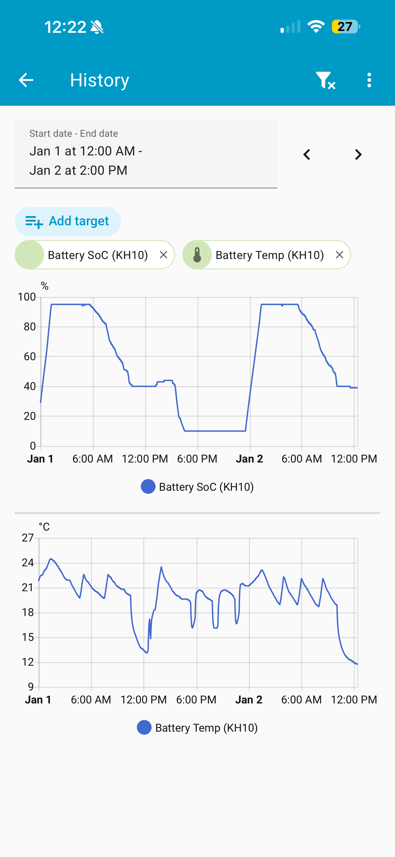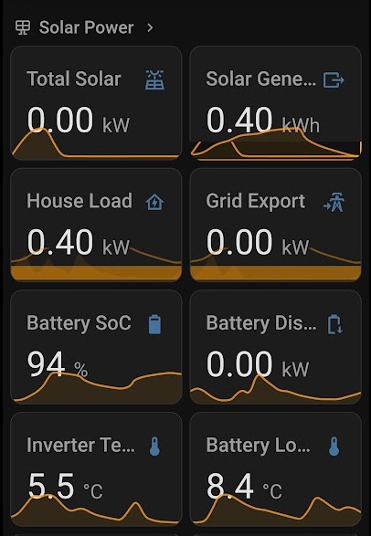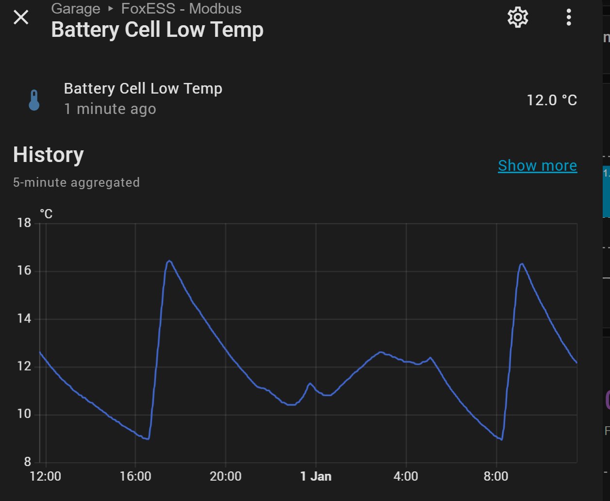 There are actually a variety of different battery temperatures, I suspect the high one is the BMS battery temperature, which is the temperature inside the BMS. This will be noticeably higher than the 'BMS cell temperature low' reading, which is the temperature of the coldest cell. The 'BMS cell temperature low' is the important one as far as the battery heating system is concerned.However, the fox ess cloud data is showing the battery temperature as much hotter (which doesn't make much sense as it's 6c outside).