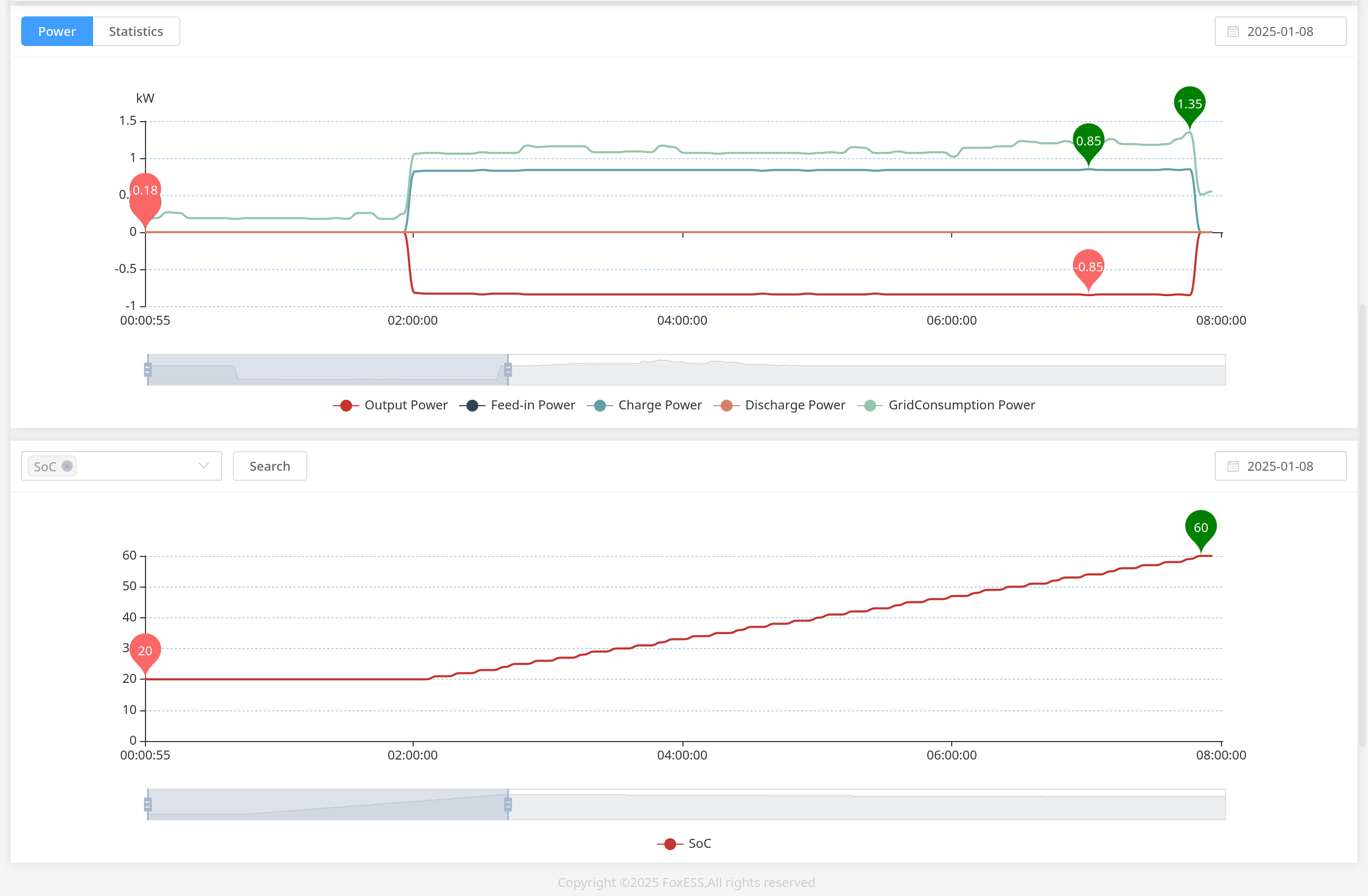 This morning, the battery was at about 44% at 00:00 and unexpectedly started charging at that time. It charged up to 60% by 01:30 then stopped, then the scheduled charge kicked in at 02:00 and took it up to 84% by 05:00: On the morning of the 8th, it started charging as expected at 02:00 (20%), but continued until 07:50 (60%), 2h 50m past the end of the cheap rate period: The 60% SoC seems to be a common theme here. My concern is that the system is choosing to charge the battery from the grid outside of the cheapest rate period.