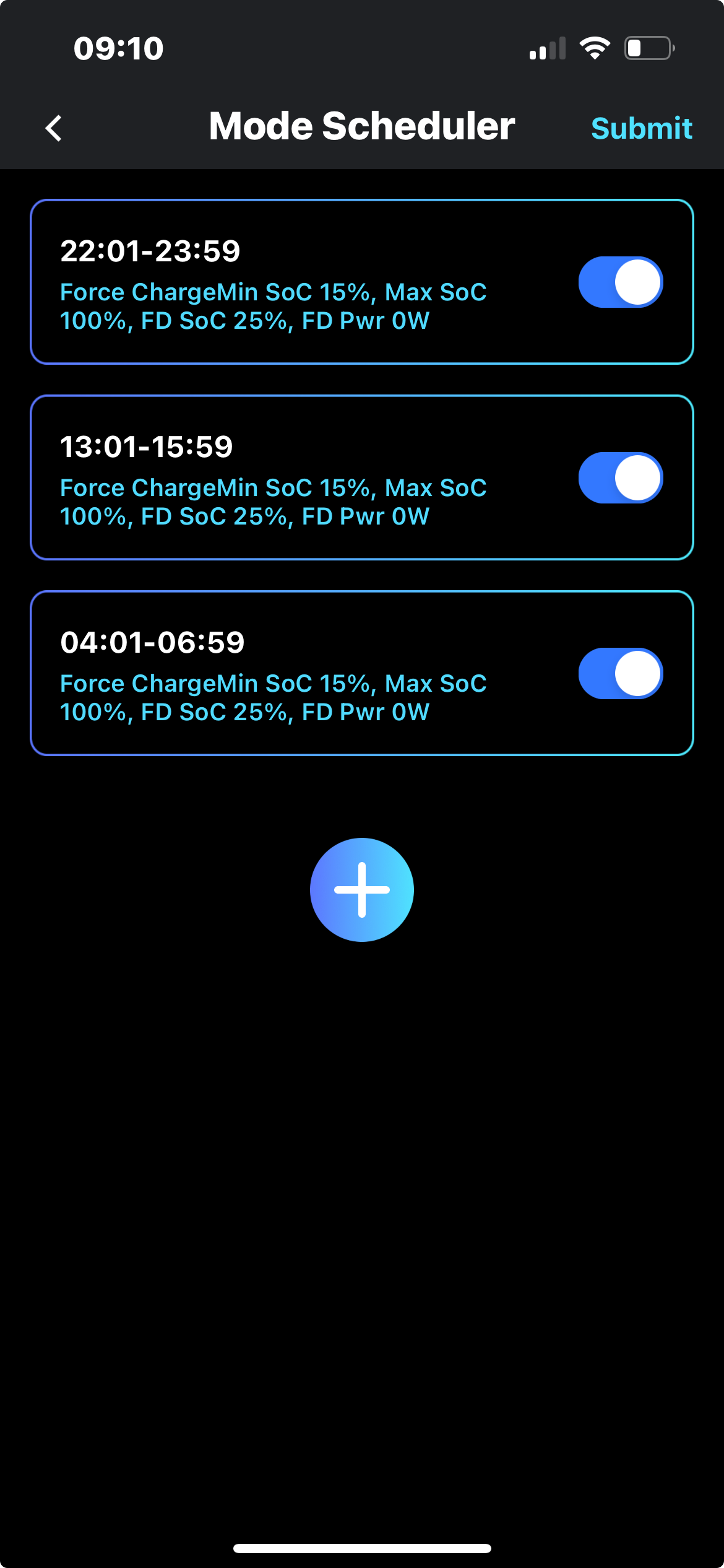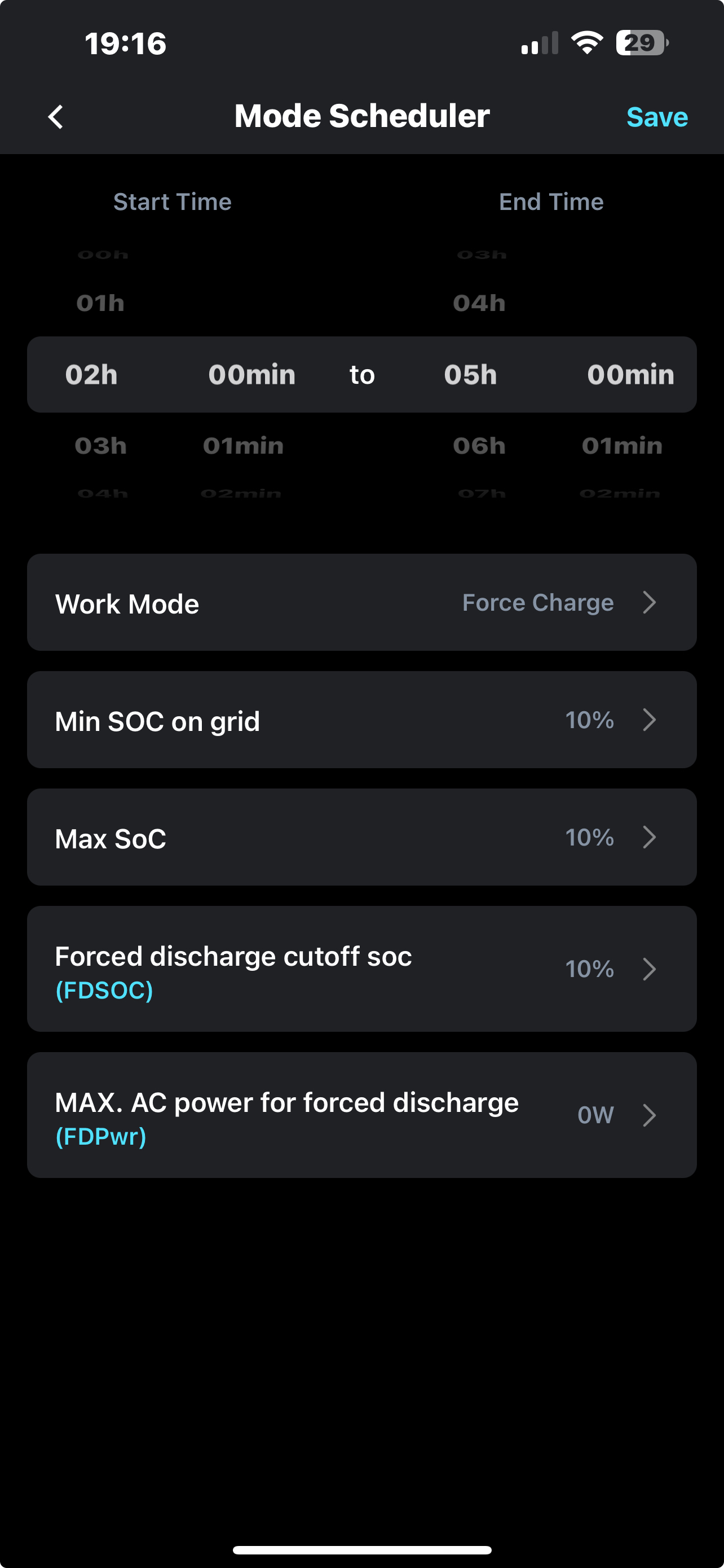 (1) set a forced charge from 0200-0500. I cannot set a Force Time Charge on the battery screen. It tells me "Unsupported Function Code". I think I have successfully used "Mode Scheduler" to Force Charge during this time - I will have to see if it works tonight. I've got Min SOC on grid and Max SOC and Forced discharge cutoff SOC all set to 10% and Max AC power for forced discharge set to 0W.