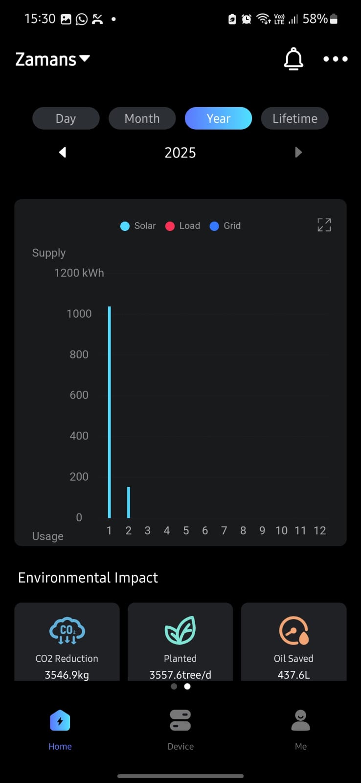 In the app I find all metrics tracked for the daily section in the data screen, with PV generation, Load and Grid export/import. However, the same data values are not aggregated and displayed in the month, year and lifetime sections/graphs. I have attached relevant screenshots from the app, the app shows filters for PV, Load and Grid data points but they are not available. I have contacted my installers but could not figure out what the reason could be.