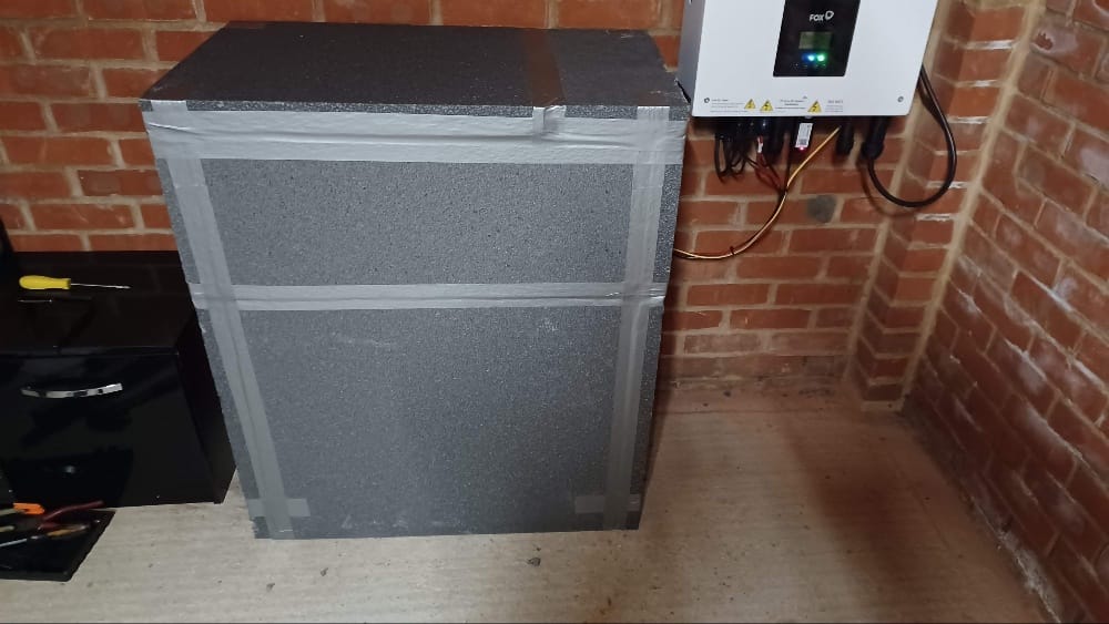 - I watched a very useful video from Will on here about insulation solutions. Unfortunately, I do not have 300mm around the battery to construct insulation (see image - any insulation structure would extend across my windows and into the garden gate/downpipe/water butt to the right). Nor am I able to do much DIY for reasons I won't go into. How can I insulate the battery? Ideally with something temporary that I can put over the battery through winter, then store in my shed the rest of the year. Every solution I can find online seems to involve building a shed around it (not possible) or is for internal/loft solutions and involves constructing a cube of non-weatherproof foam substances (presumably not ideal outdoors). Any other suggestions I've seen online seem iffy at best, e.g. putting on lagging of the sort you might put round a hot water tank, insulated covers of the sort you might tie over garden furniture... Any cheap and easy to handle suggestions gratefully received.