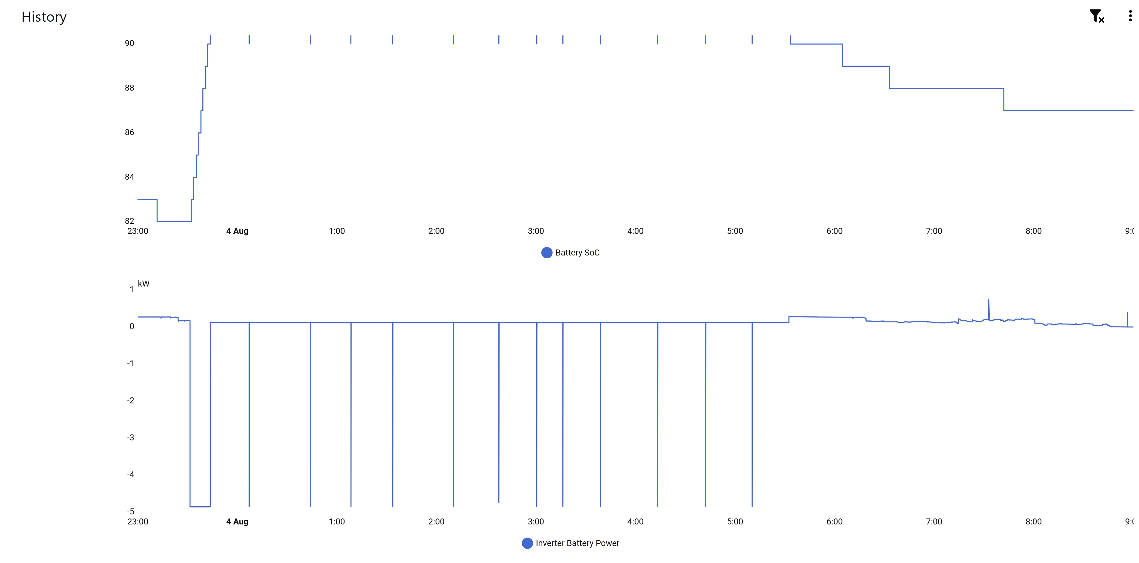 I've started seeing some really odd behaviour from my H1 (less than a year old but abandoned by Fox as previous gen). It's set to force charge during the Intelligent Octopus overnight period, but with a limit of 90% during the summer. What's happening is that it's charging at 5kW to 91%, supplying the house load until it falls to 90%, then charging briefly back to 91% throughout this period.